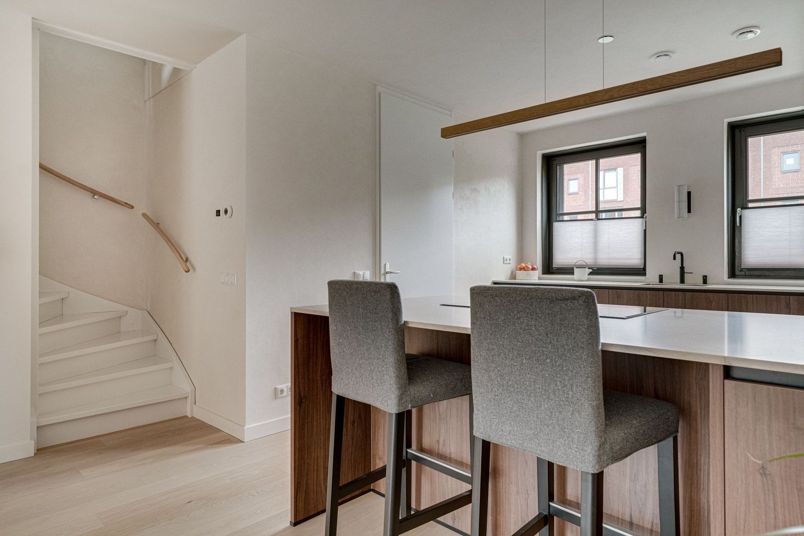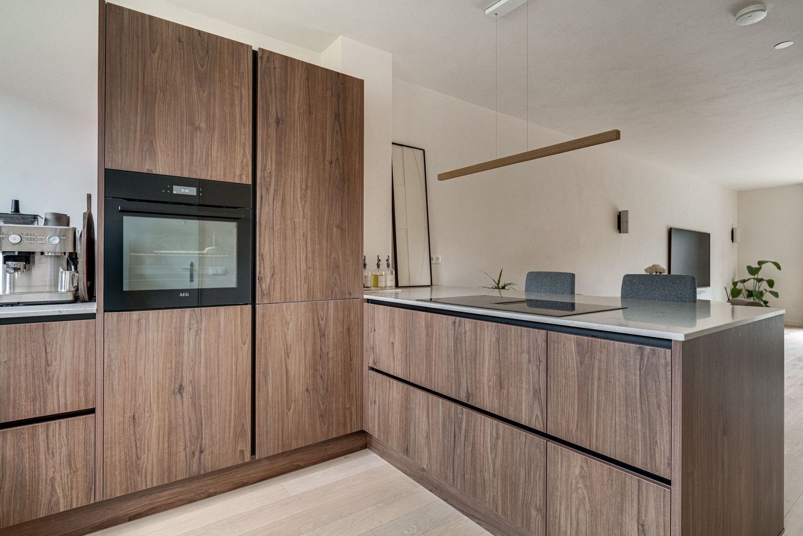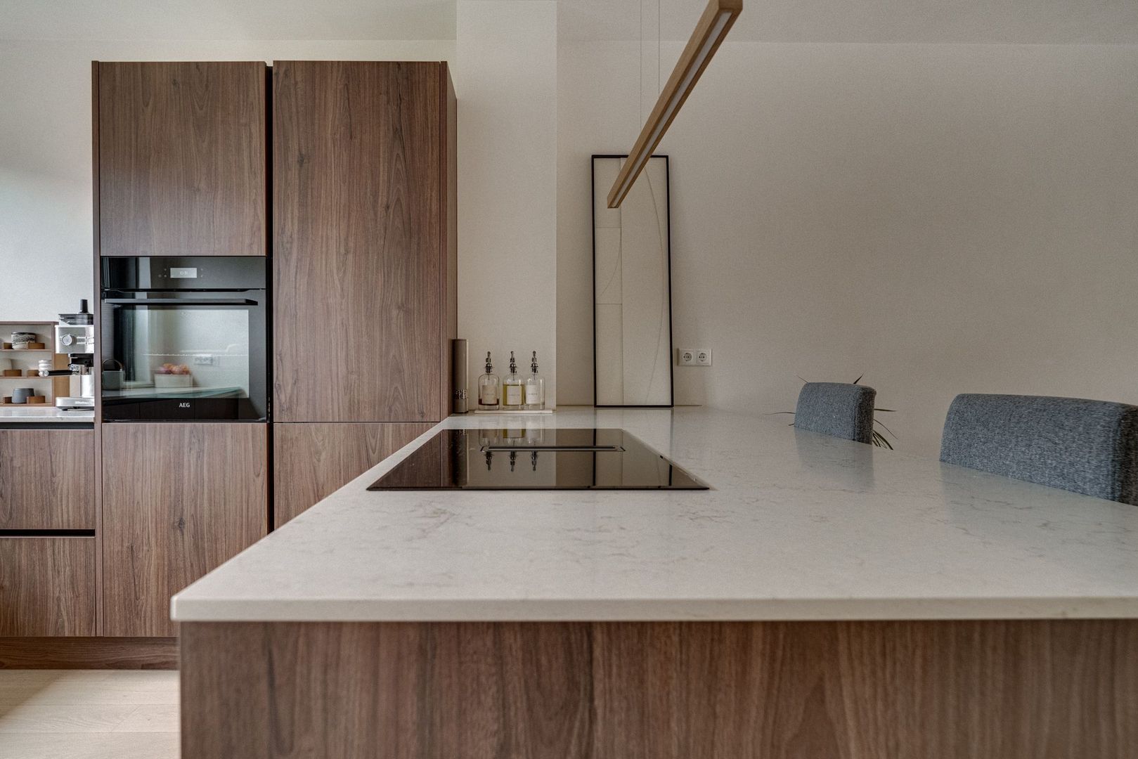 De moderne keuken in U-opstelling is volledig uitgerust: Quooker, inductiekookplaat met geïntegreerde afzuiging, vaatwasser, grote koelkast, ingebouwde zeeppompjes en veel opbergruimte. Het krasvaste composieten werkblad en de gezellige eetbar maken het compleet. Hier komen comfort en design perfect samen.