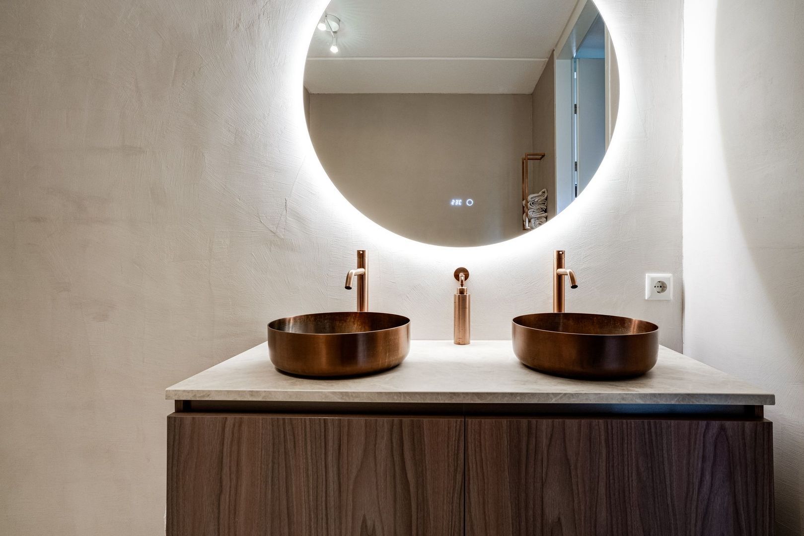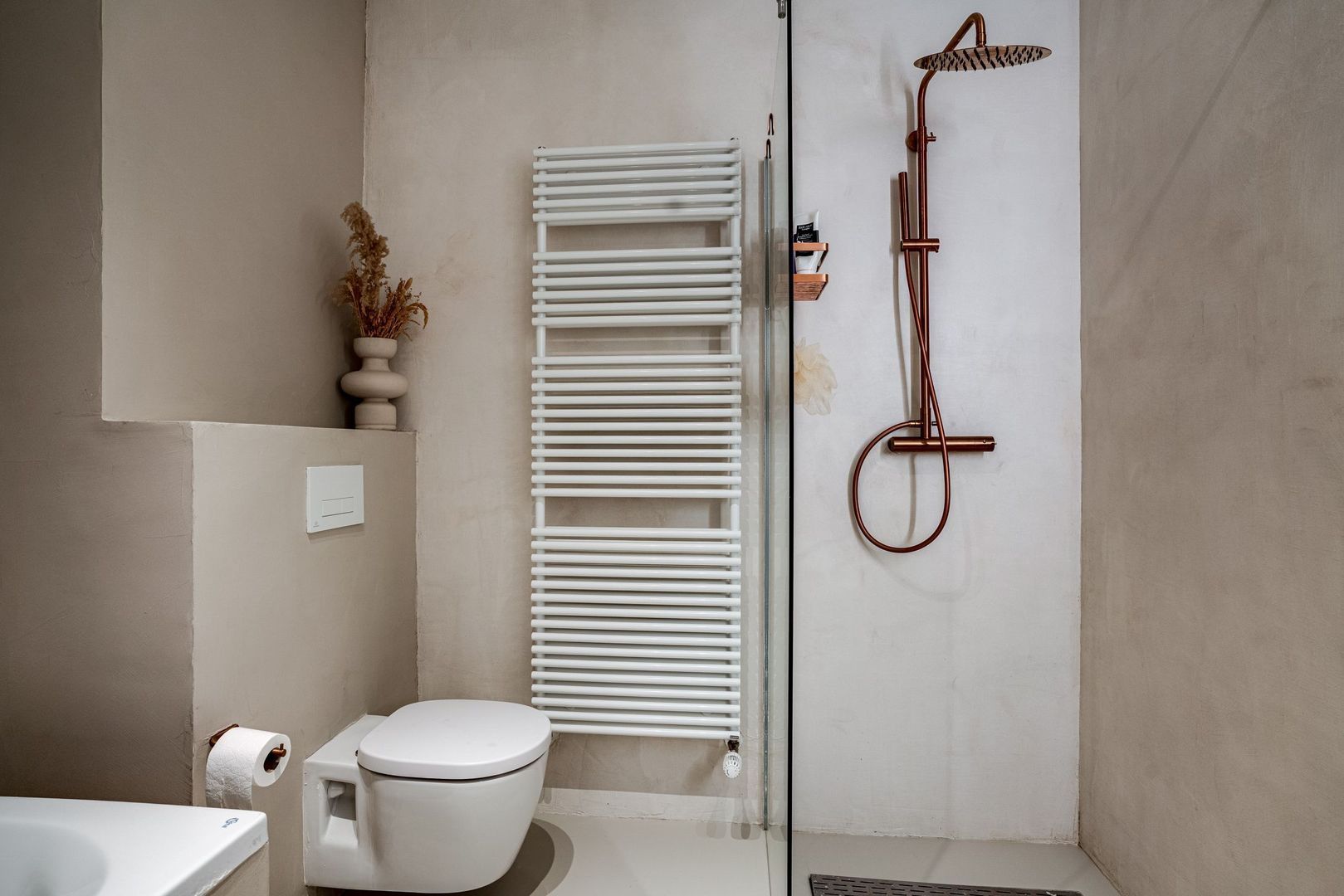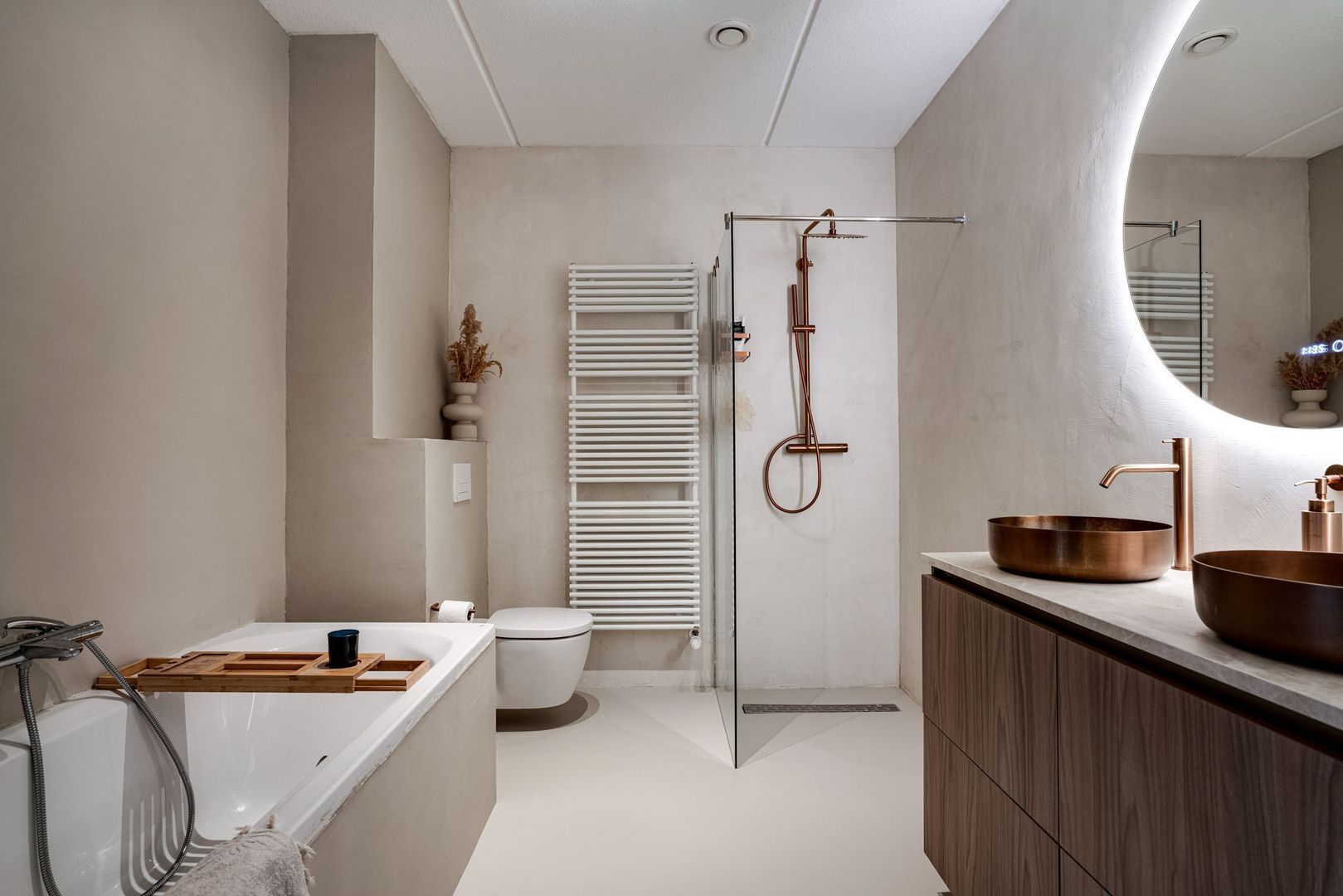 De badkamer is afgewerkt met beton cirè wanden, een gietvloer en een keramiek blad. Voorzien van een inloopdouche, ligbad, dubbele wastafel en tweede toilet.