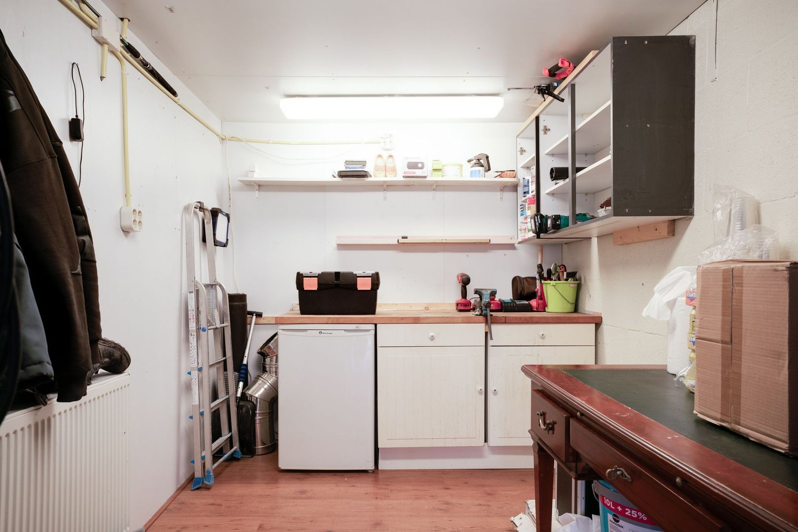 Entree van de woning is in de hal. De hal is voorzien van de meterkast, de trapopgang, het moderne toilet met fonteintje en een trapkast met bergruimte. Vanuit de hal kom je in de woonkamer. De woonkamer heeft vloerverwarming en een airco. Er zijn dubbele openslaande deuren aanwezig naar de tuin. Er is een half open keuken welke is vernieuwd in 2019. Het is een moderne keuken uitgevoerd in een L-opstelling en voorzien van diverse inbouwapparatuur zoals een inductiekookplaat, afzuigkap, oven, vaatwasser en een koelkast. Vanuit de keuken is er ook toegang tot de oprit en de schuur. De begane grond is voorzien van een granito vloer en de woonkamer heeft vloerverwarming.