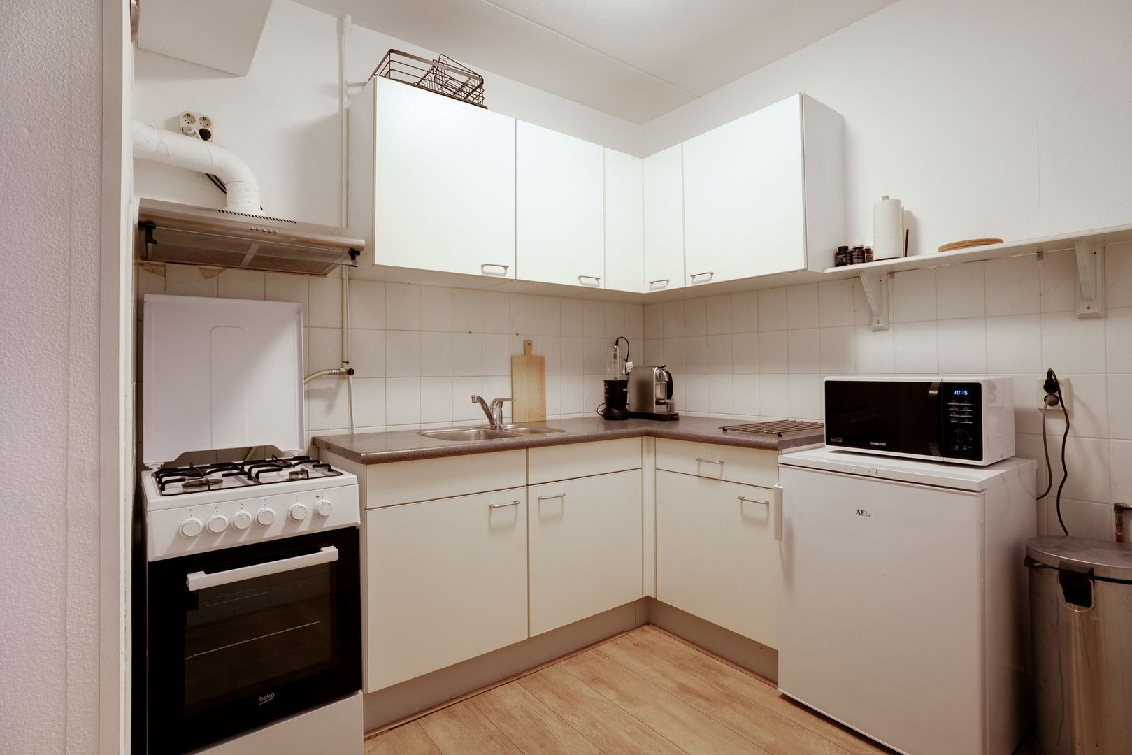 De woonkamer is ruim en licht en staat in verbinding met de open keuken, die is voorzien van een eenvoudig maar functioneel keukenblok. Vanuit de woonkamer is het balkon bereikbaar.