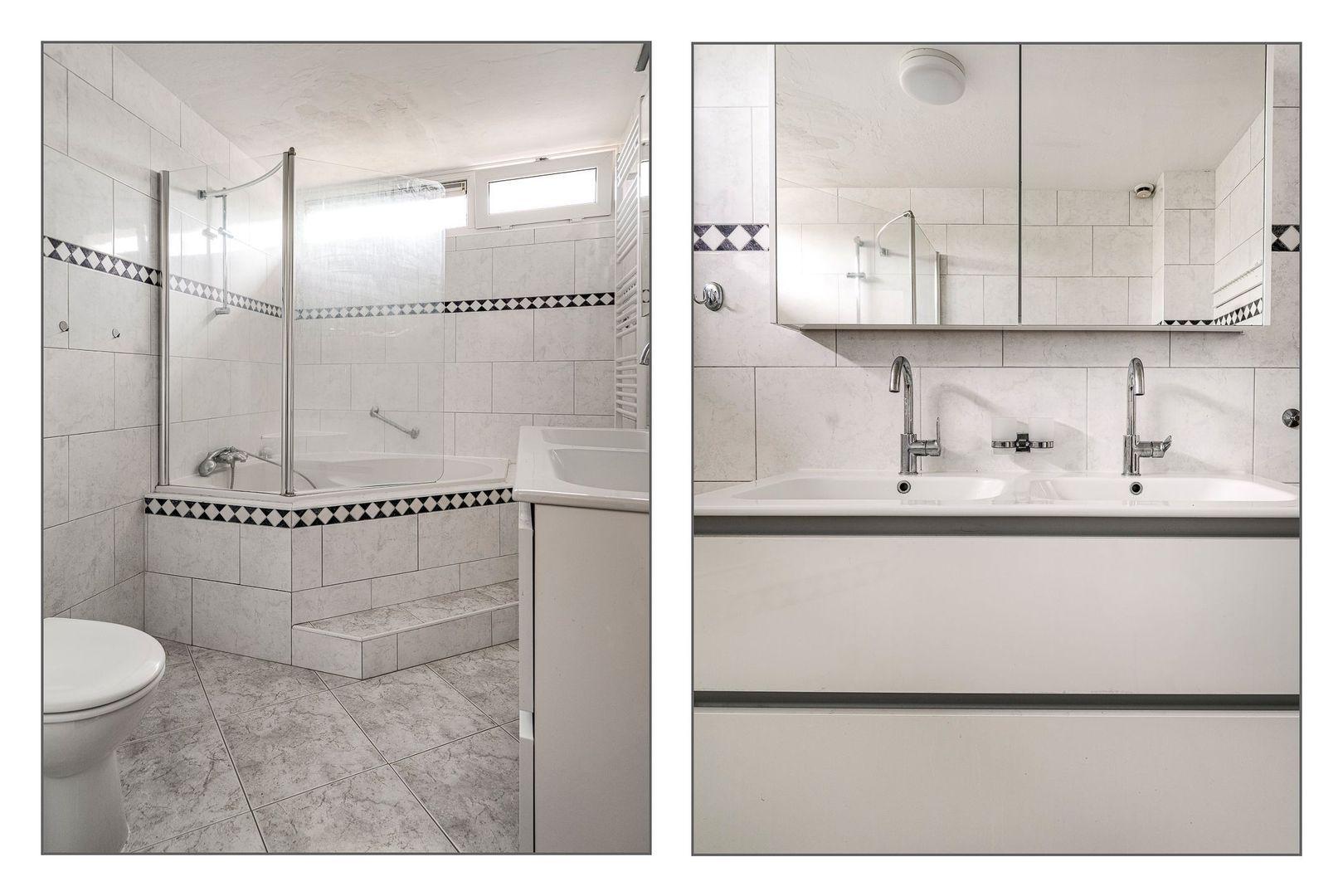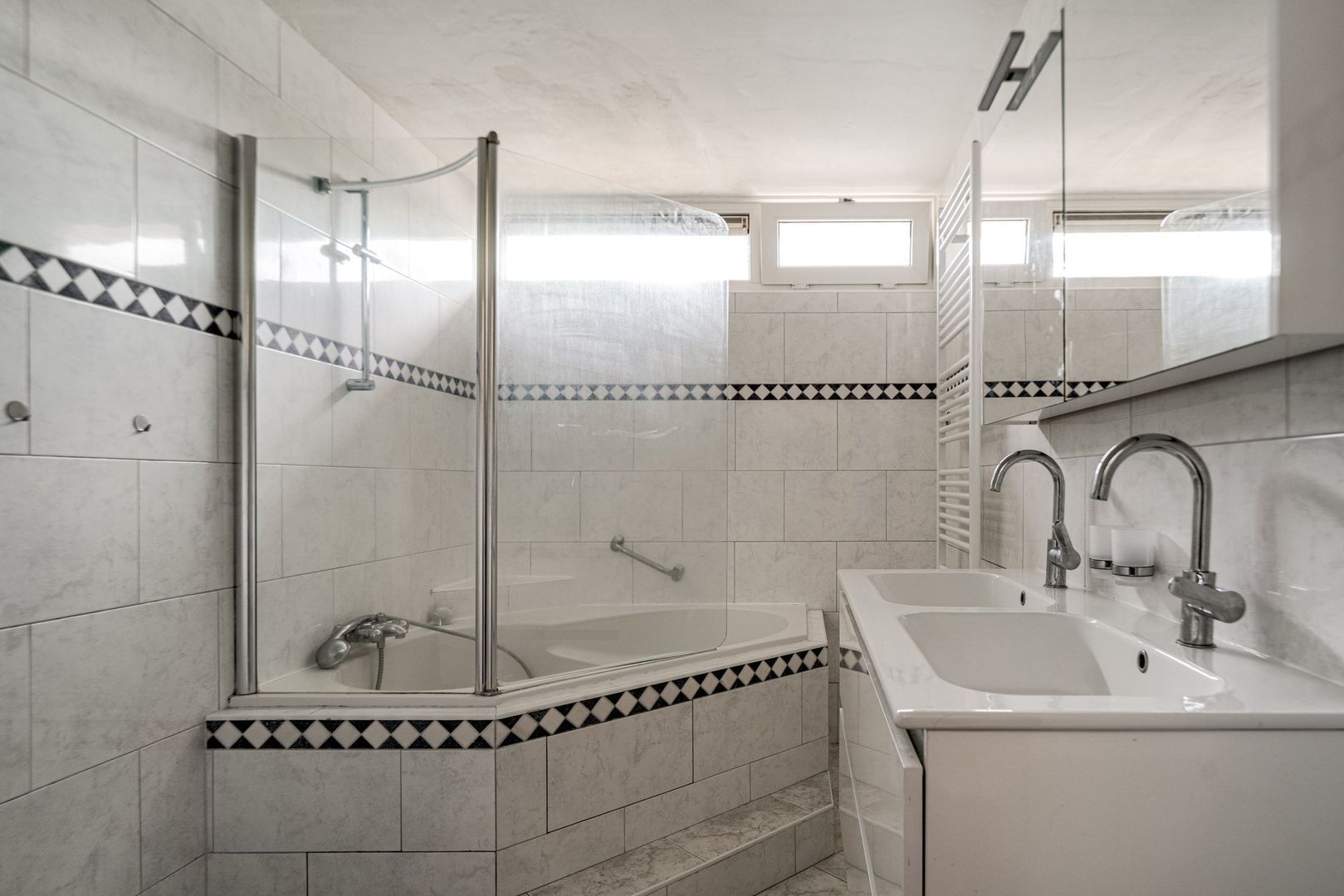 Overloop met toegang tot drie goed bemeten slaapkamers en een nette badkamer voorzien van een groot bad, dubbel wastafel met meubel en tweede toilet. De kamers zijn licht en praktisch ingedeeld.