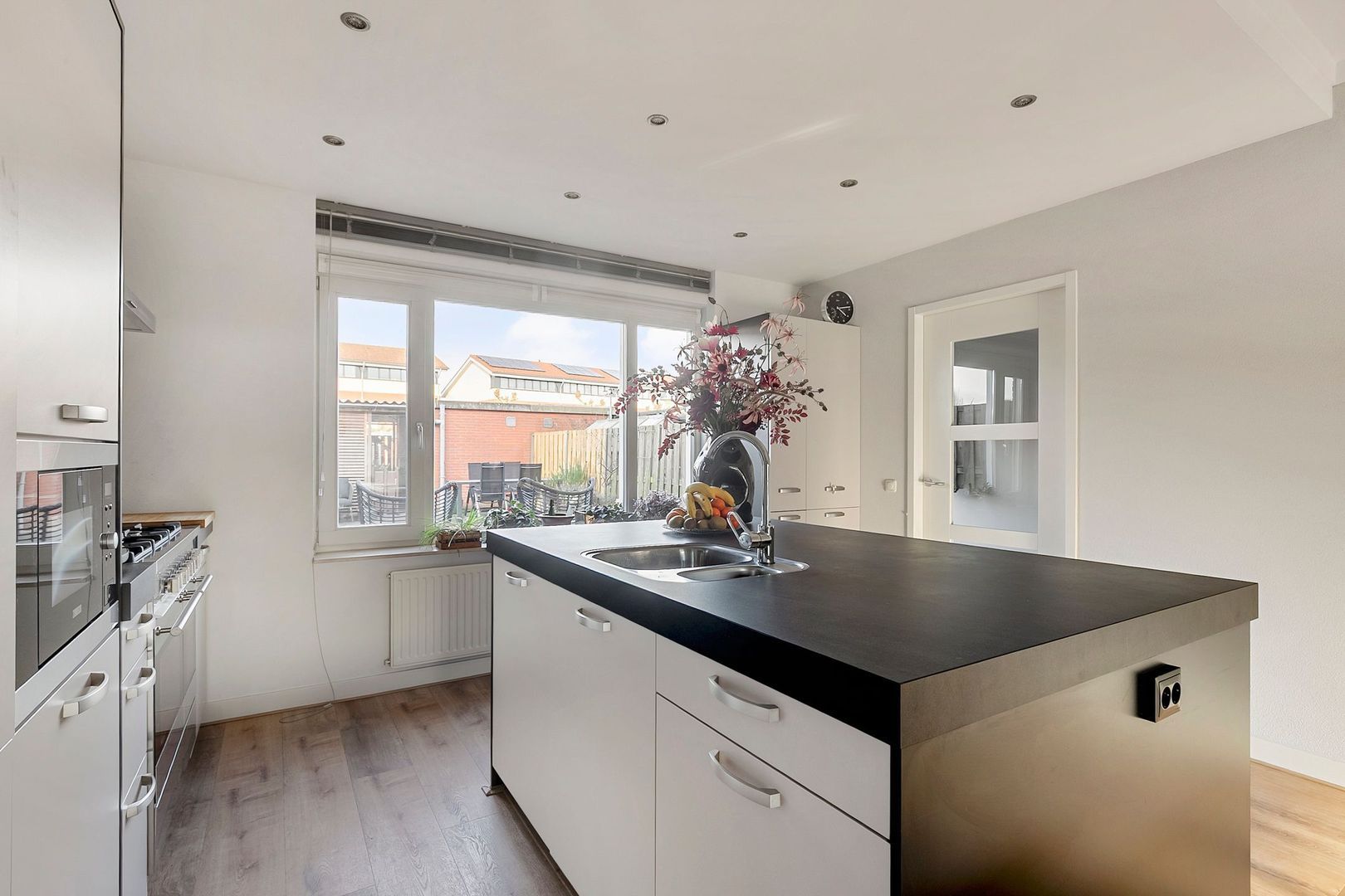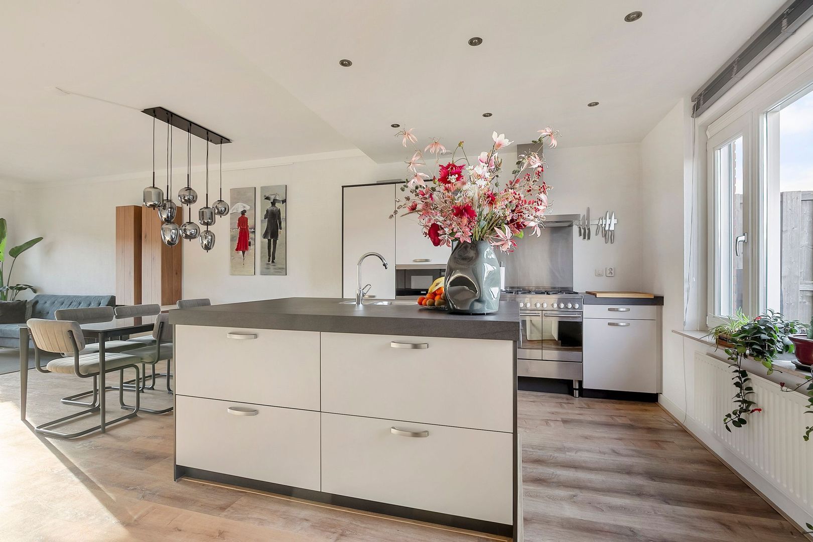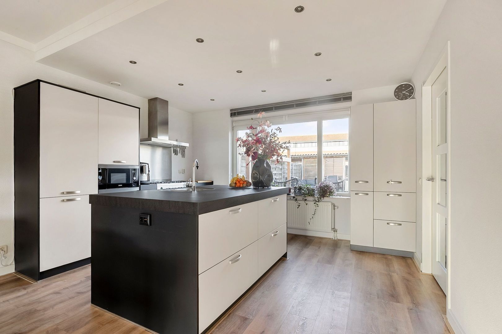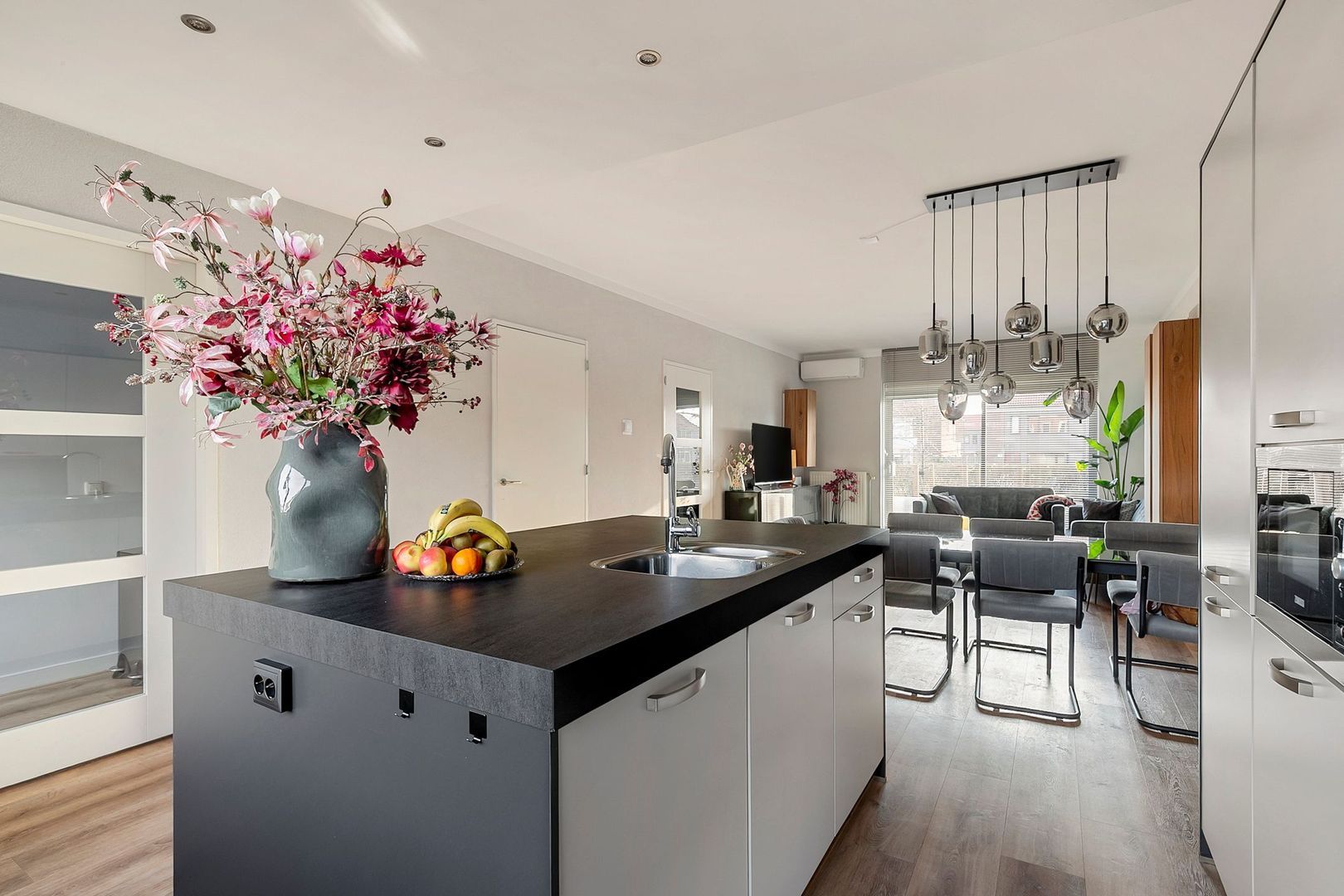 Aan de achterzijde bevindt zich de luxe open keuken met een recht keukenblok, een spoeleiland met veel bergruimte en een derde blok met hoge kasten waaronder een apothekerskast. De keuken is voorzien van diverse inbouwapparatuur zoals een 6-pits fornuis met dubbele oven, koelkast, vriezer, magnetron, vaatwasser en close-in boiler.