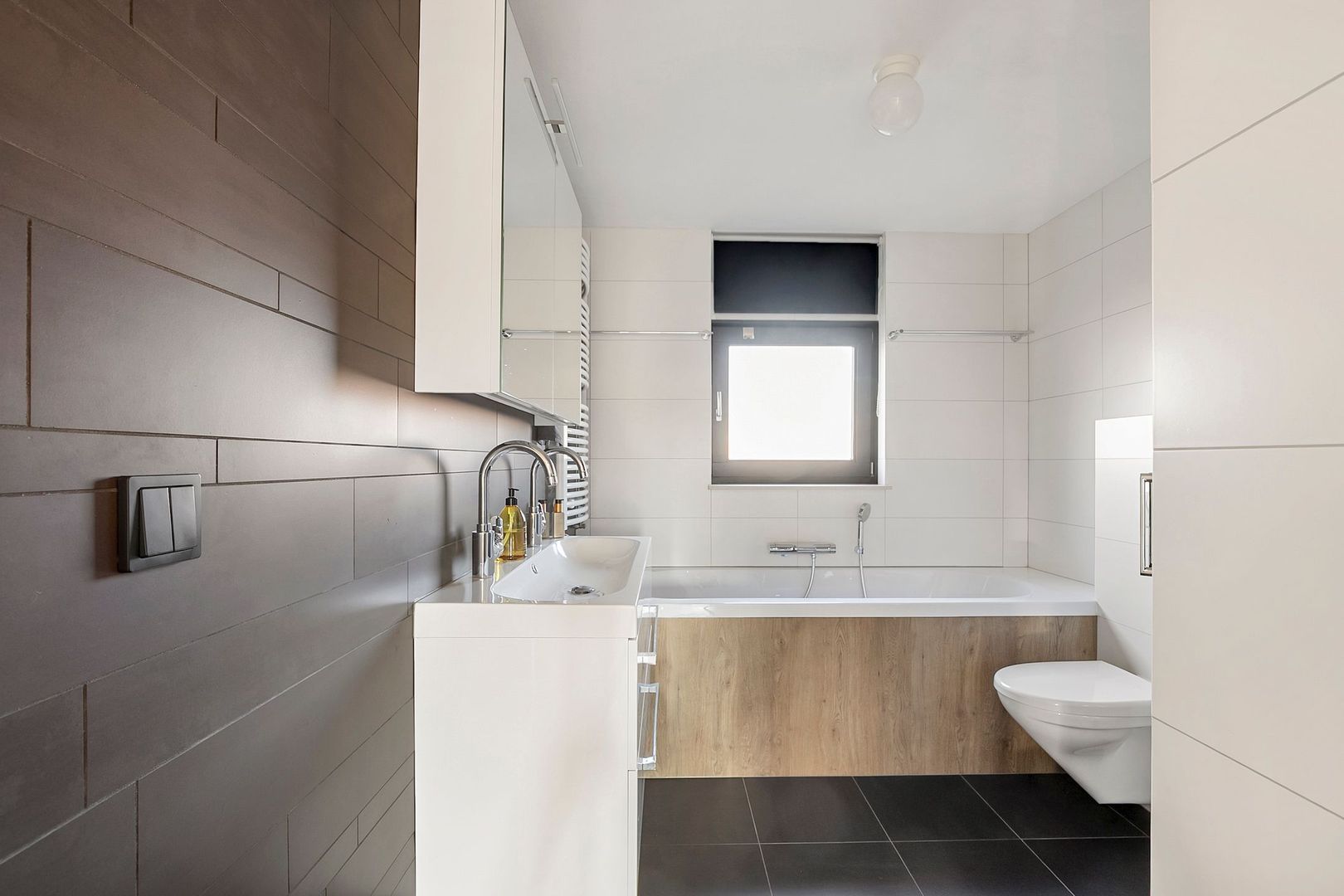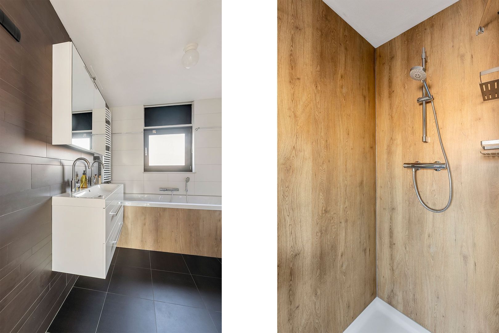 • Moderne badkamer met ligbad, douche en dubbele wastafel;