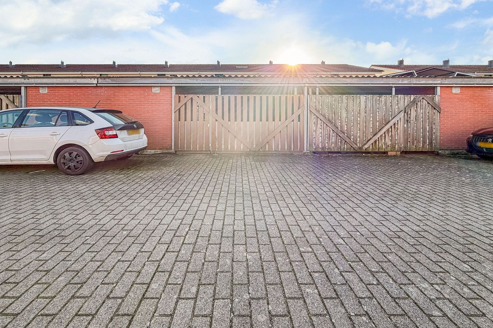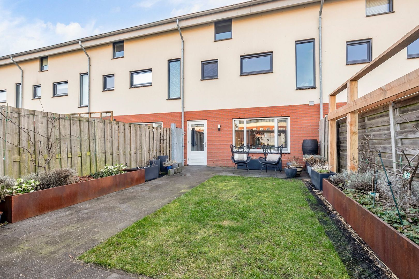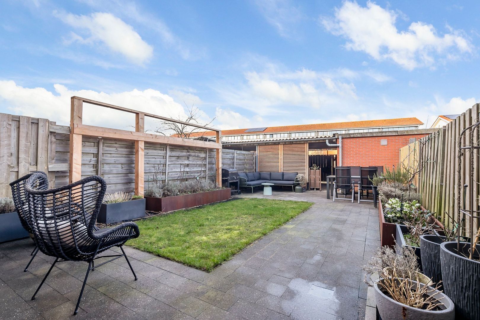 Aan de achterzijde bevindt zich een afsluitbare carport met stalen deur en een ruime berging voor fietsen. De zonnige achtertuin beschikt over meerdere terrassen waar je op verschillende momenten van de dag van de zon kunt genieten. Via de schuifpui in de woonkamer bereik je tevens de zonnige voortuin.