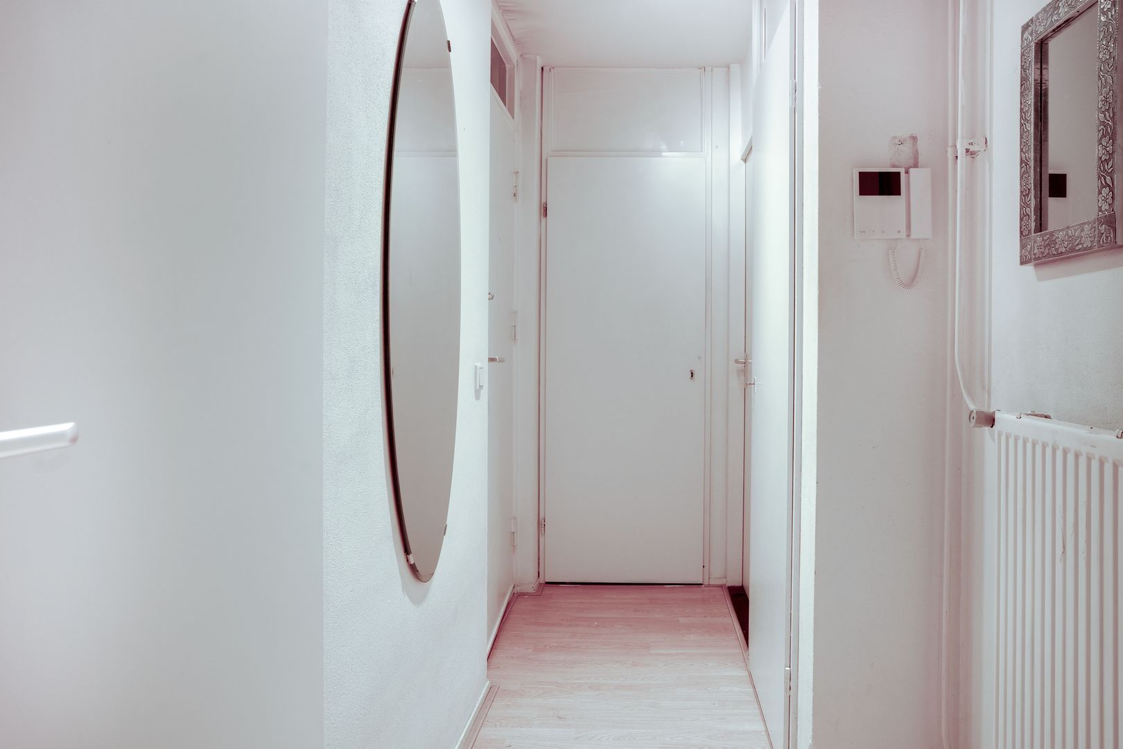Entree van het appartement is in de hal. Vanuit deze hal kom je in alle woonruimtes. Er is een ruime slaapkamer met een speelse, schuine muur waar je kasten kunt plaatsen. De badkamer is voorzien van een douchehoek, het toilet, de wastafel en de wasmachine aansluiting.