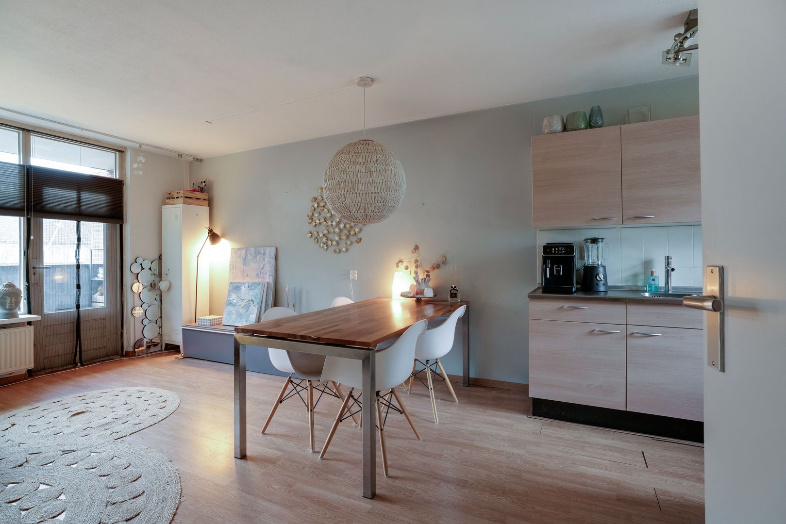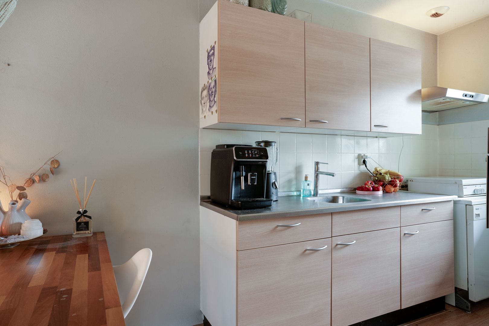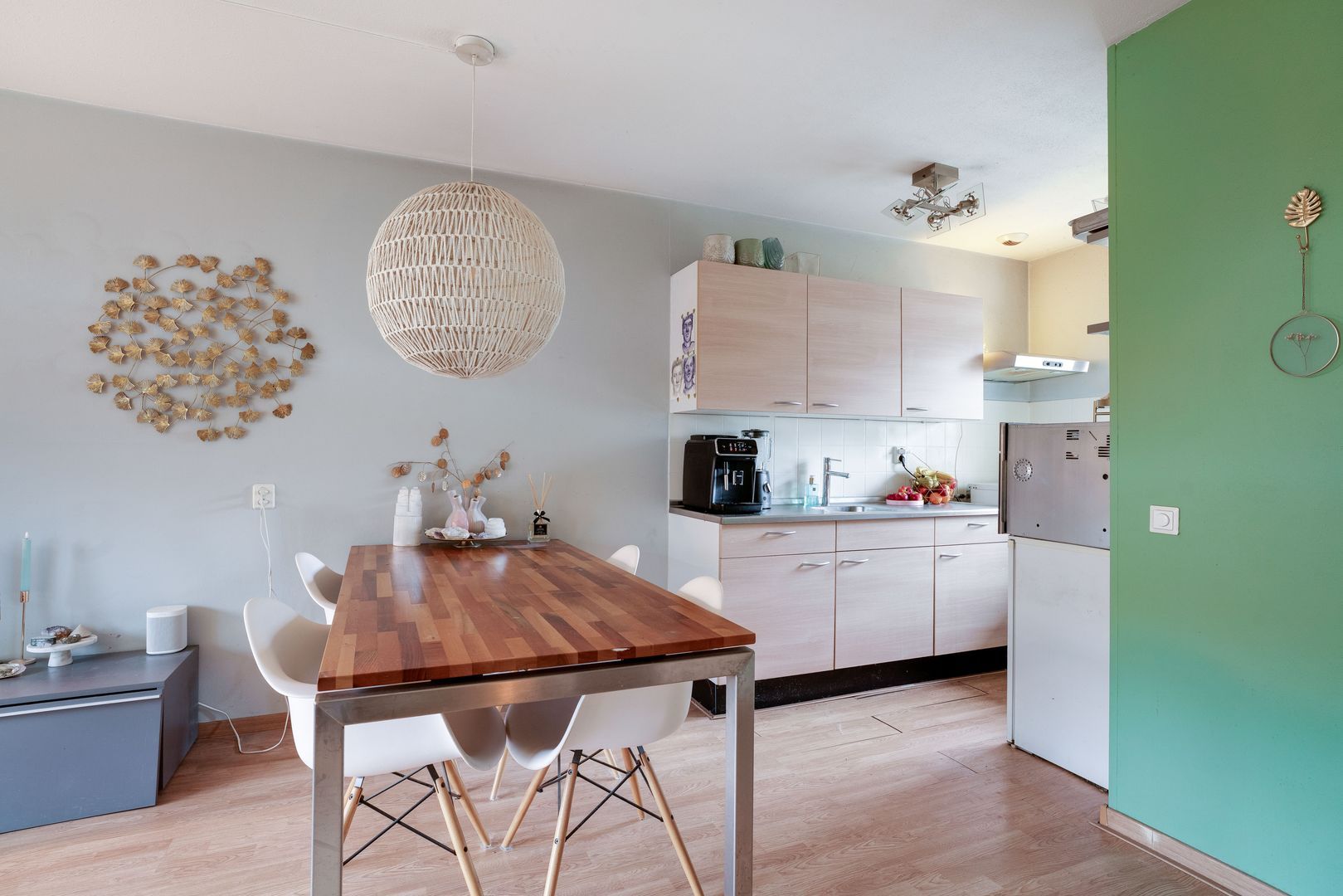 Aan het einde van de hal is de woonkamer met de open keuken. De woonkamer heeft een knusse zithoek met zicht op het balkon en tussen de zithoek en de keuken staat de eethoek als leuke verdeling van de ruimte. De open keuken heeft een recht keukenblok en het raam heeft een leuk zicht op de voorzijde van het complex.