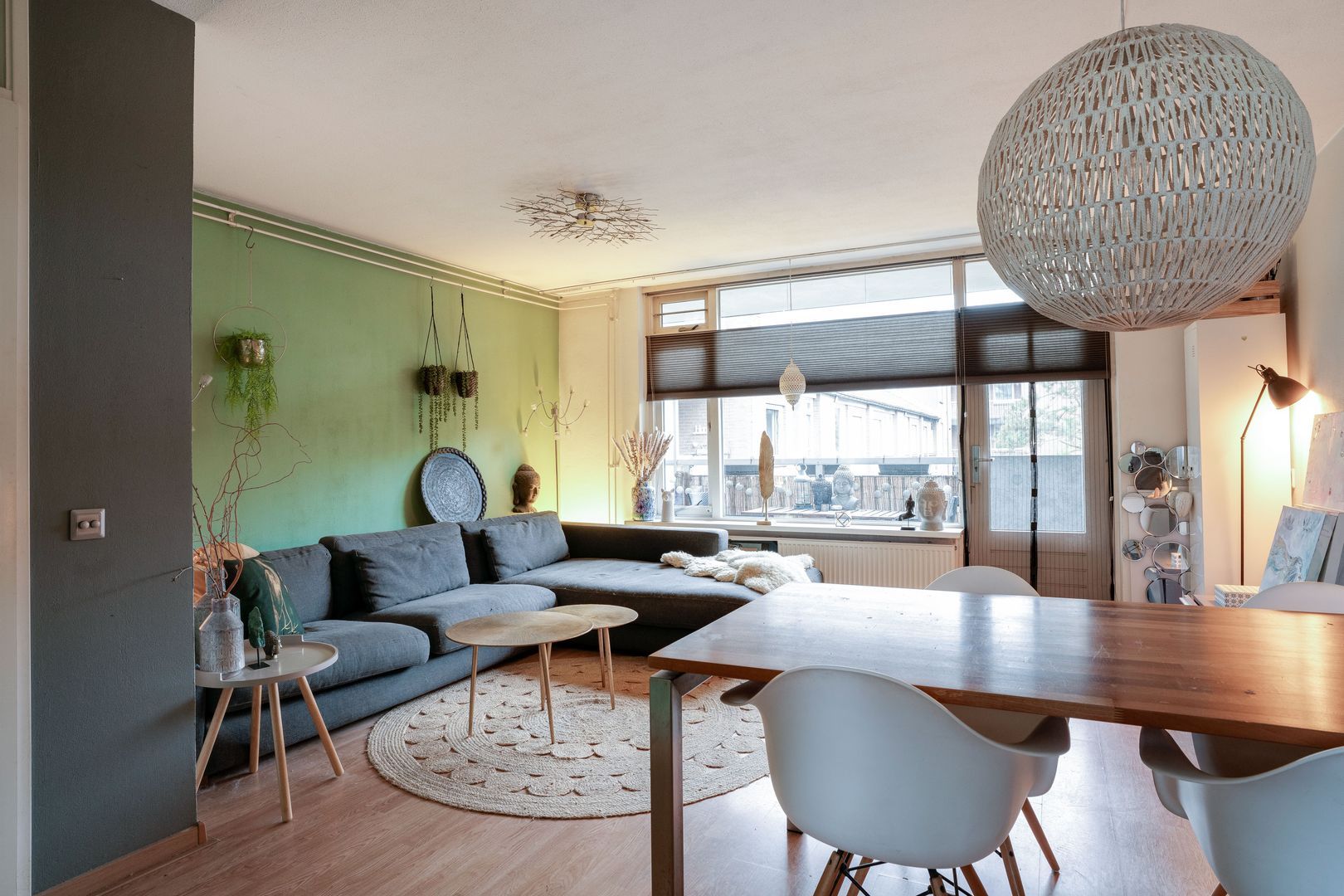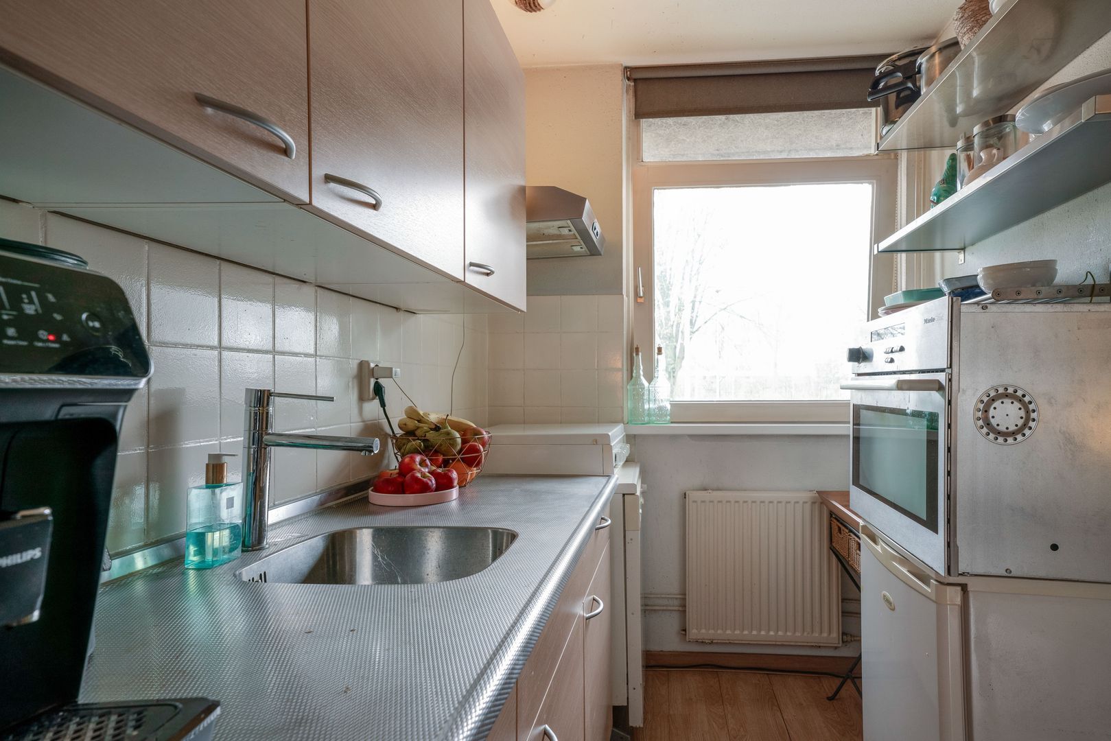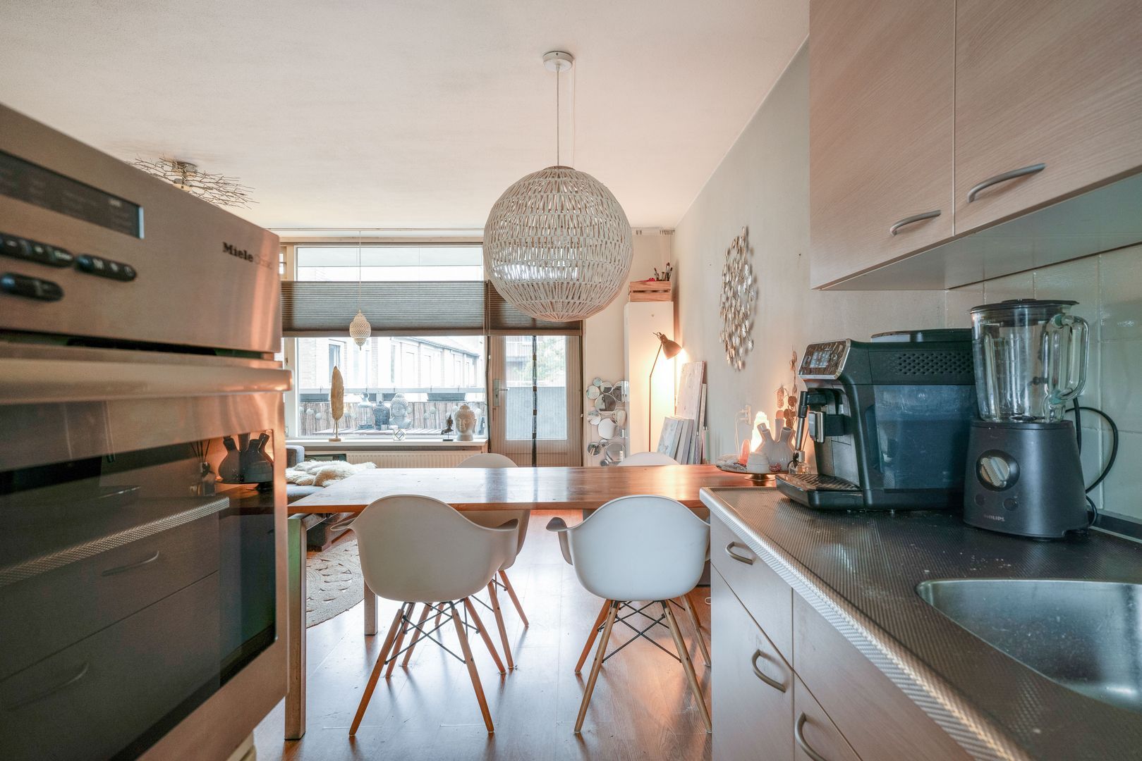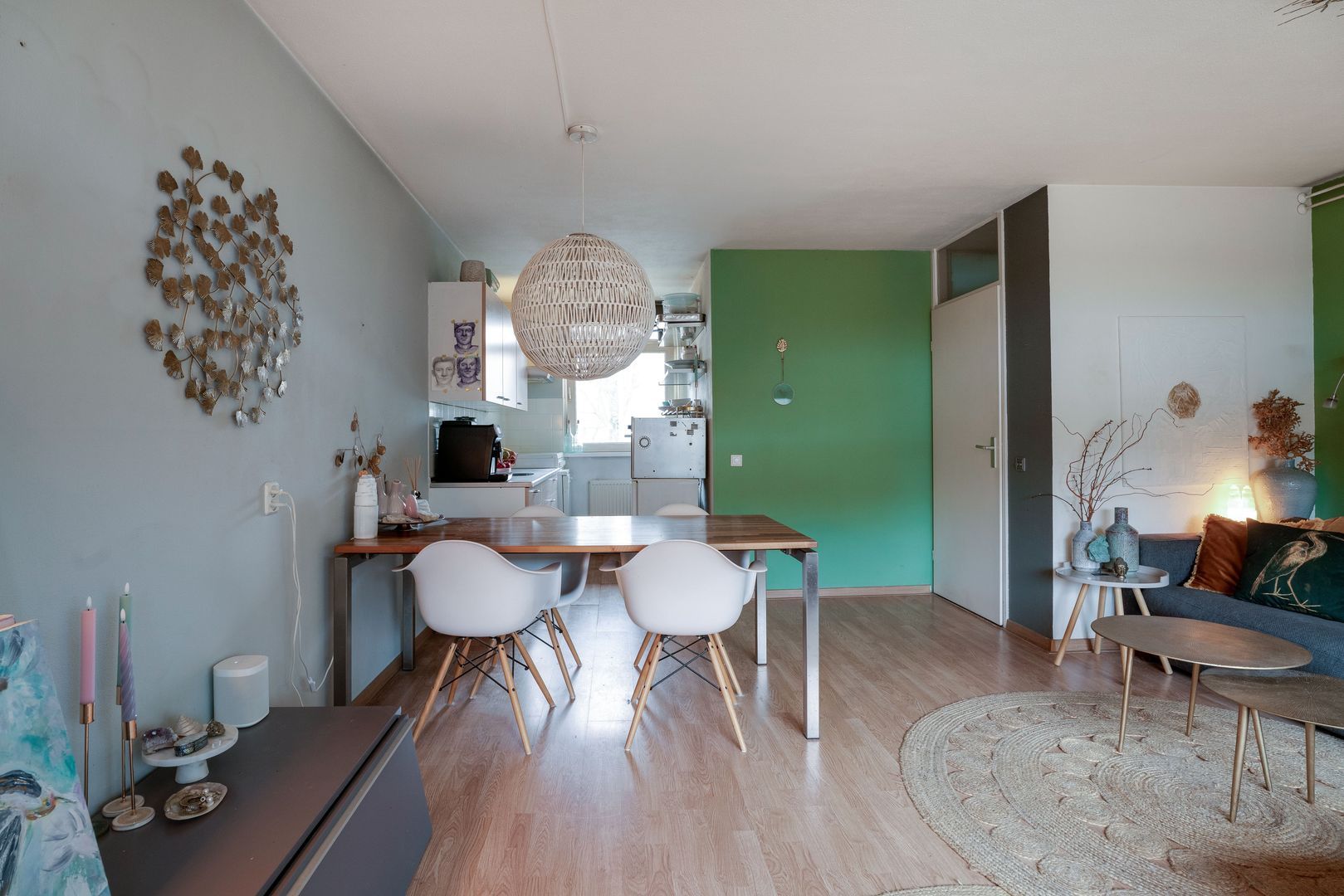 Aan het einde van de hal is de woonkamer met de open keuken. De woonkamer heeft een knusse zithoek met zicht op het balkon en tussen de zithoek en de keuken staat de eethoek als leuke verdeling van de ruimte. De open keuken heeft een recht keukenblok en het raam heeft een leuk zicht op de voorzijde van het complex.