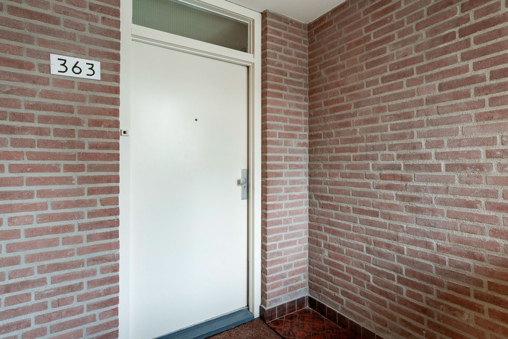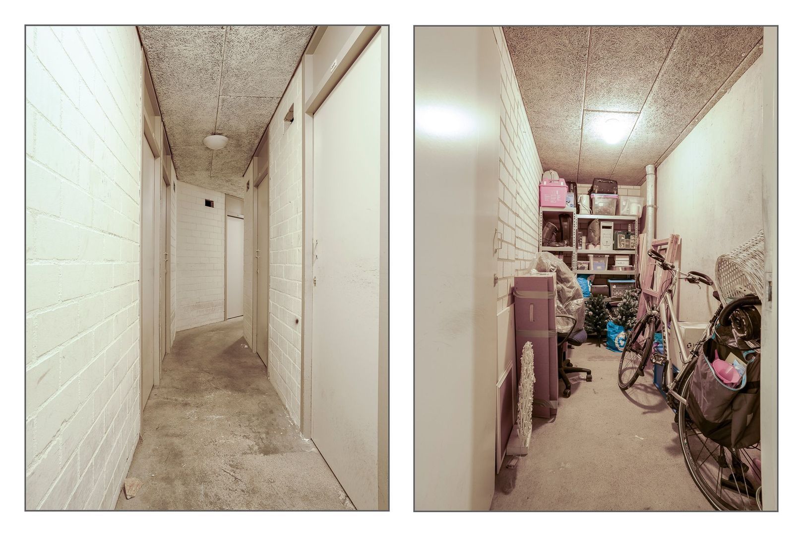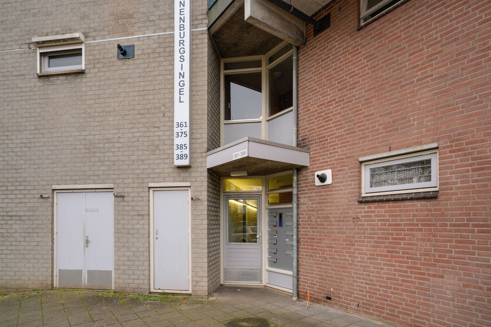 Afgesloten entree van het complex d.m.v. een digitaal bellentableau met hiernaast de brievenbussen. Er is een trappenhuis naar de verdiepingen.