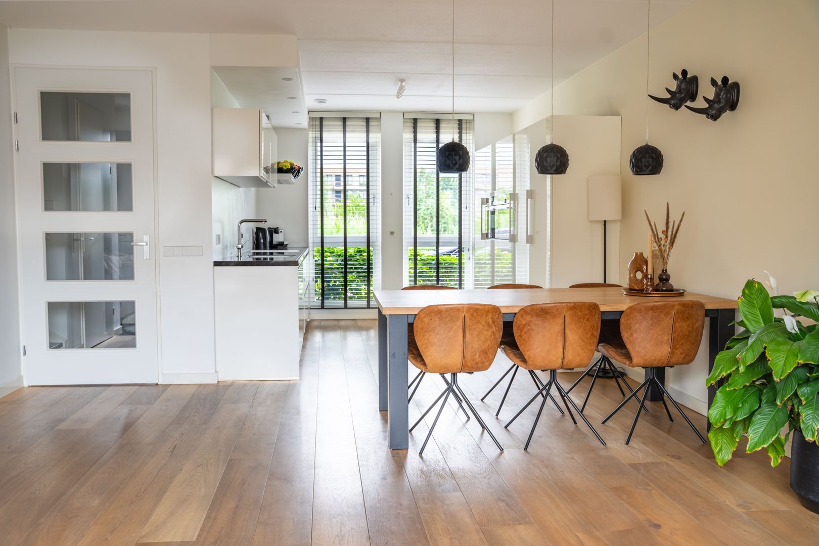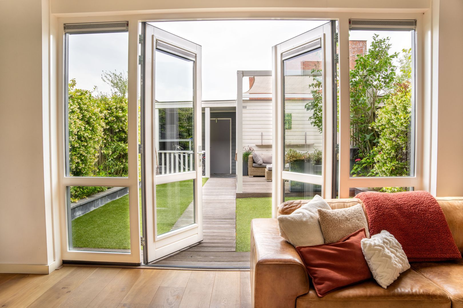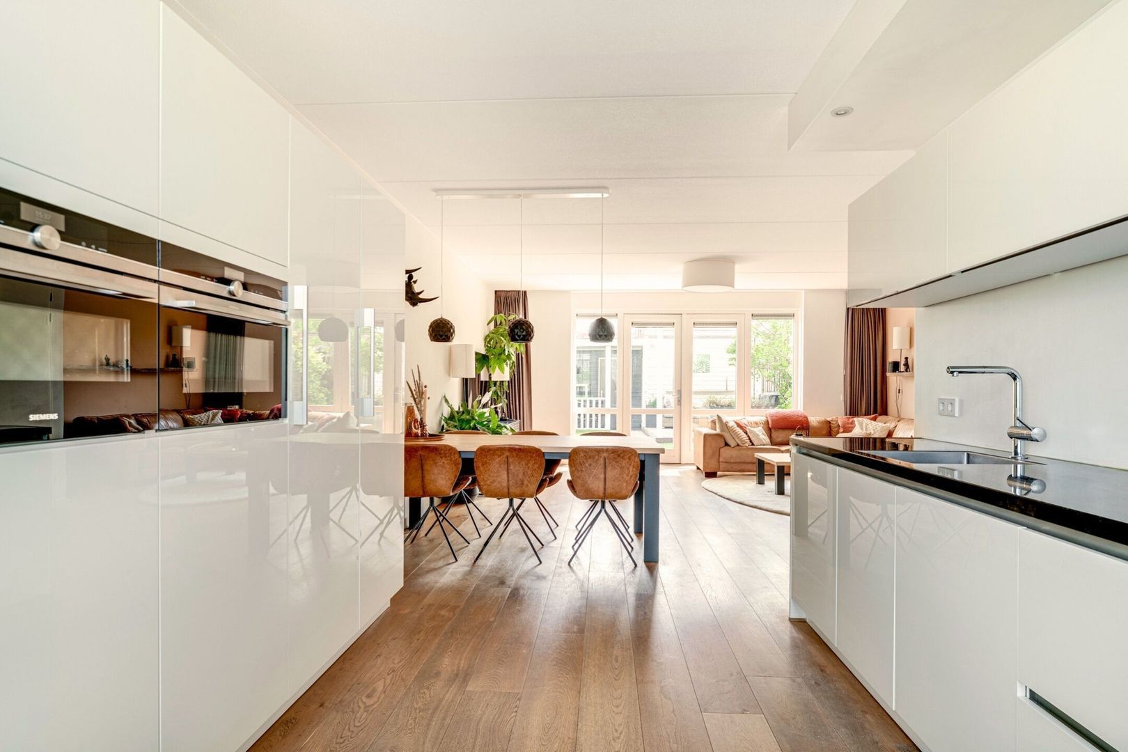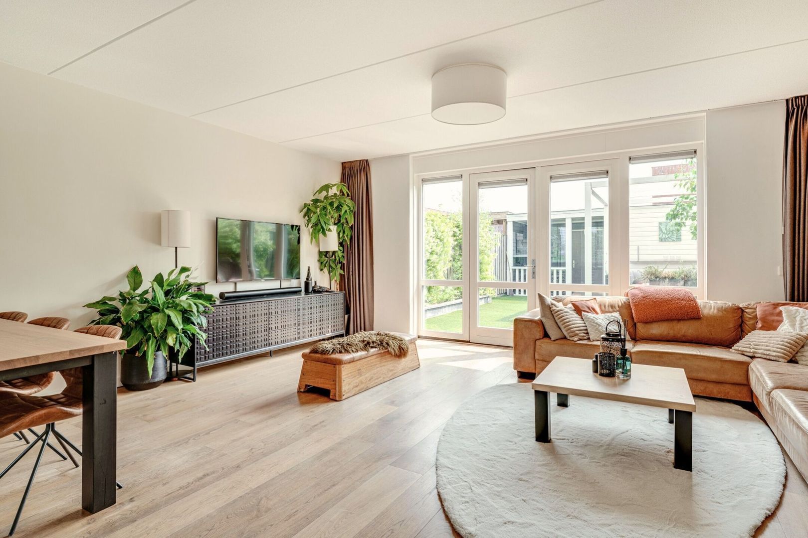 De woonkamer voelt licht en open dankzij de hoge plafonds en brede beukmaat van 6 meter. De eikenhouten vloer met vloerverwarming, luxe keuken met granieten blad en de goede isolatie zorgen voor een gevoel van rust en comfort. Door de openslaande deuren loop je zo de zonnige tuin in, waar je in de mooi aangelegde tuin kunt genieten van je eigen plek.