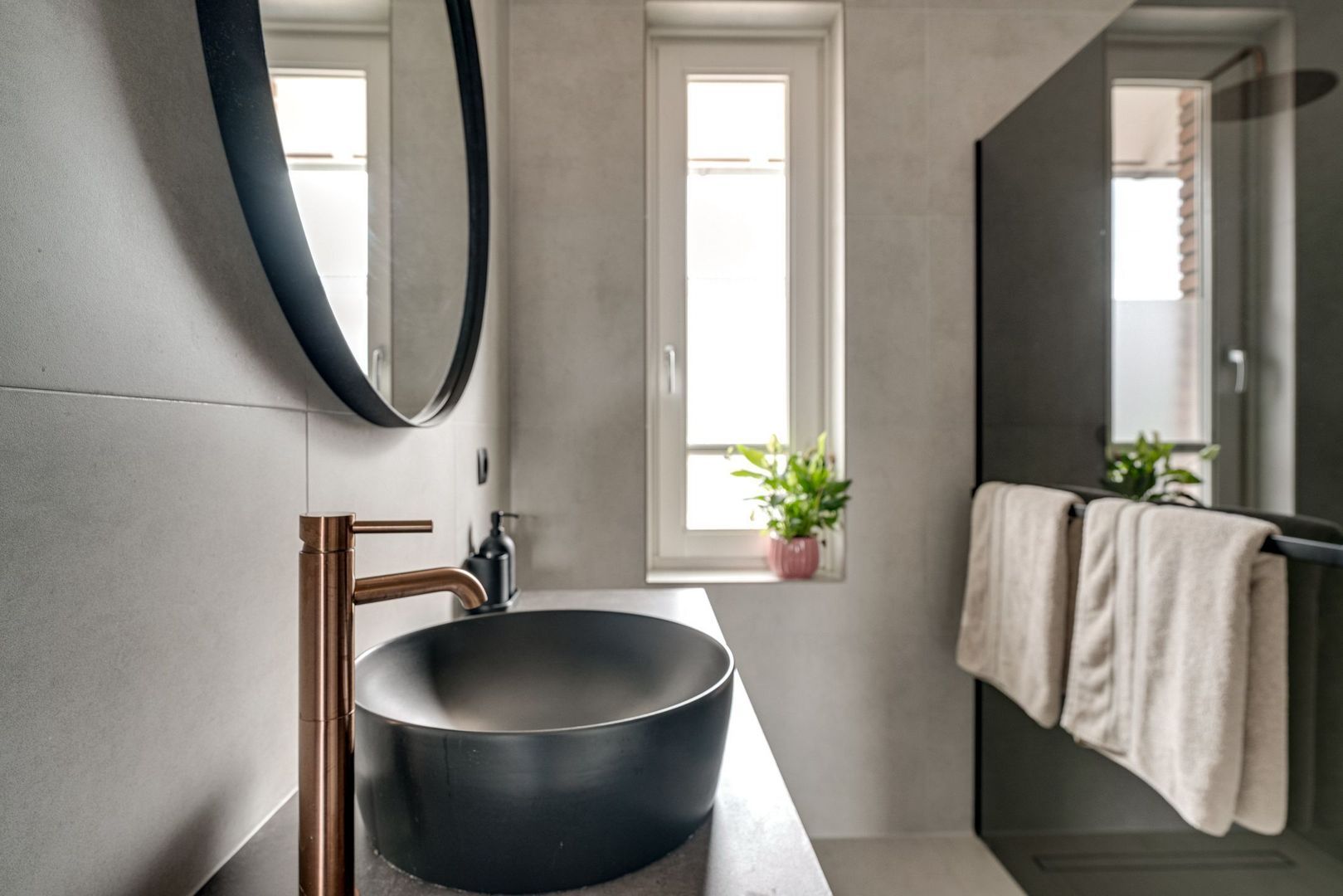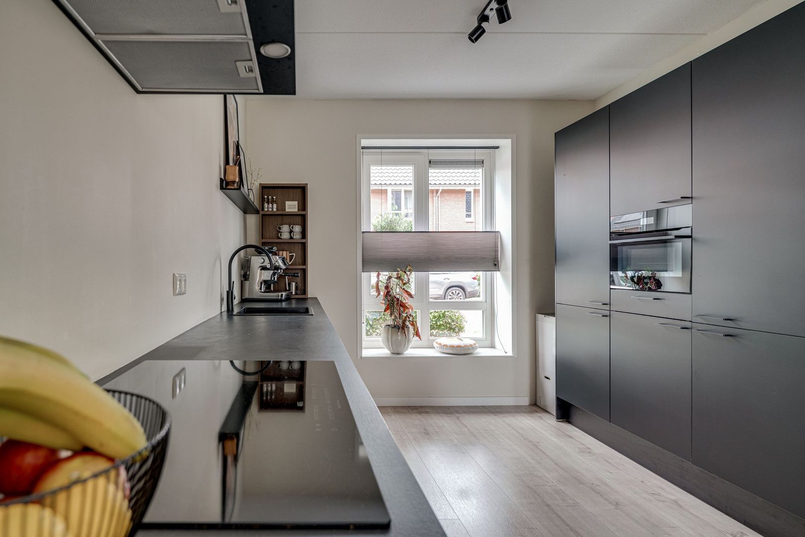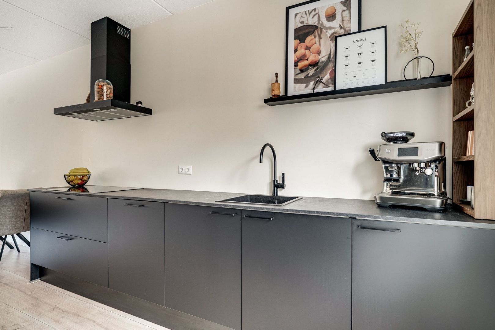 • Er is een luxe, moderne keuken in een zwarte kleuropstelling;