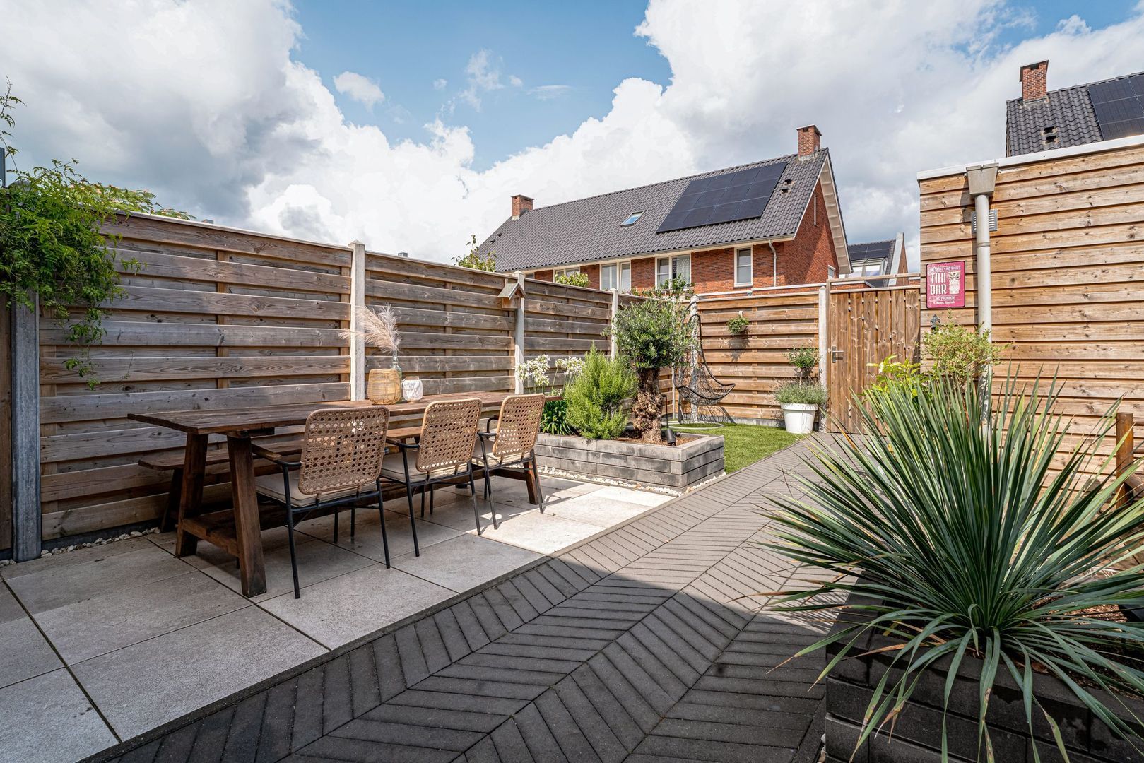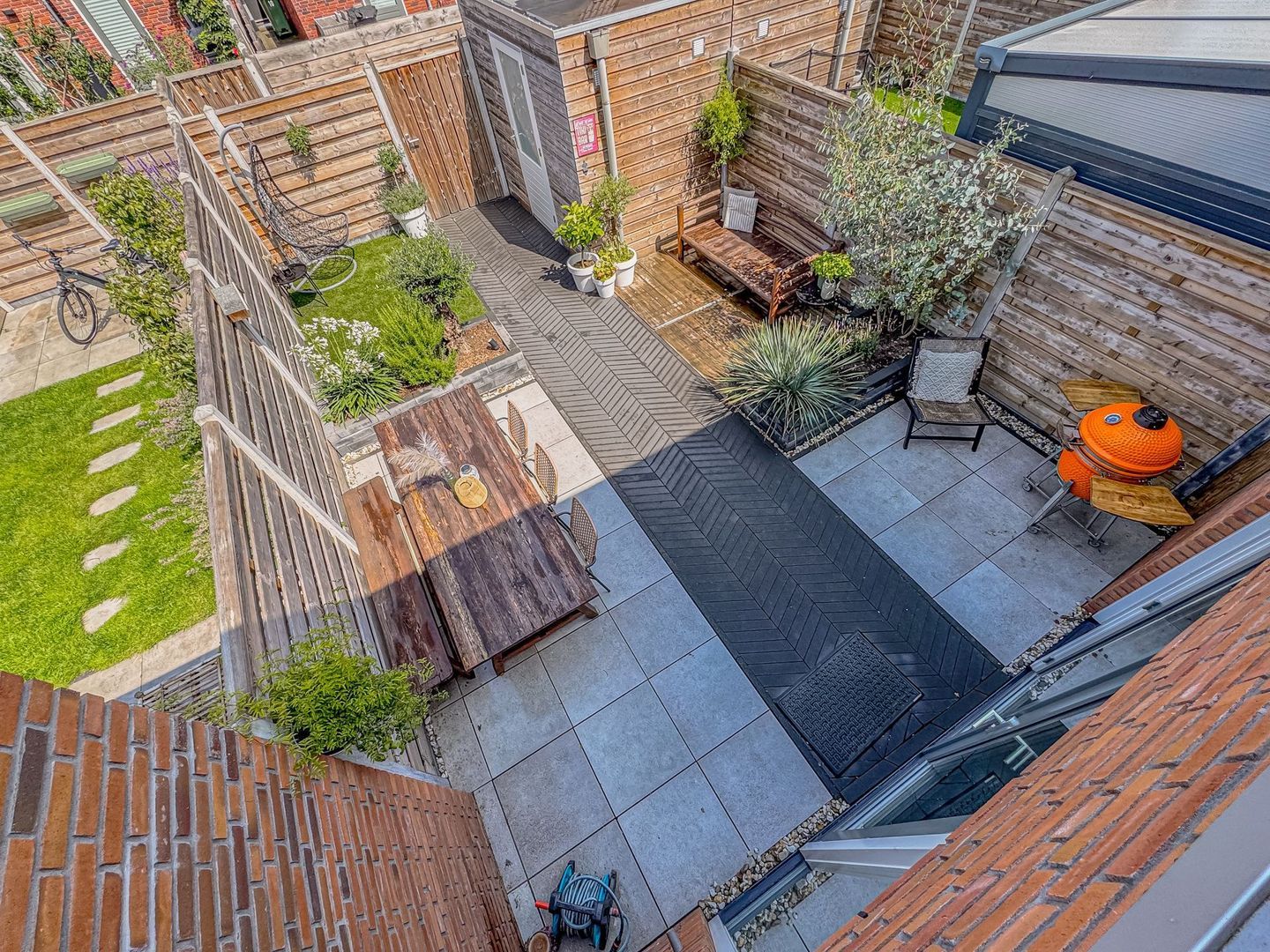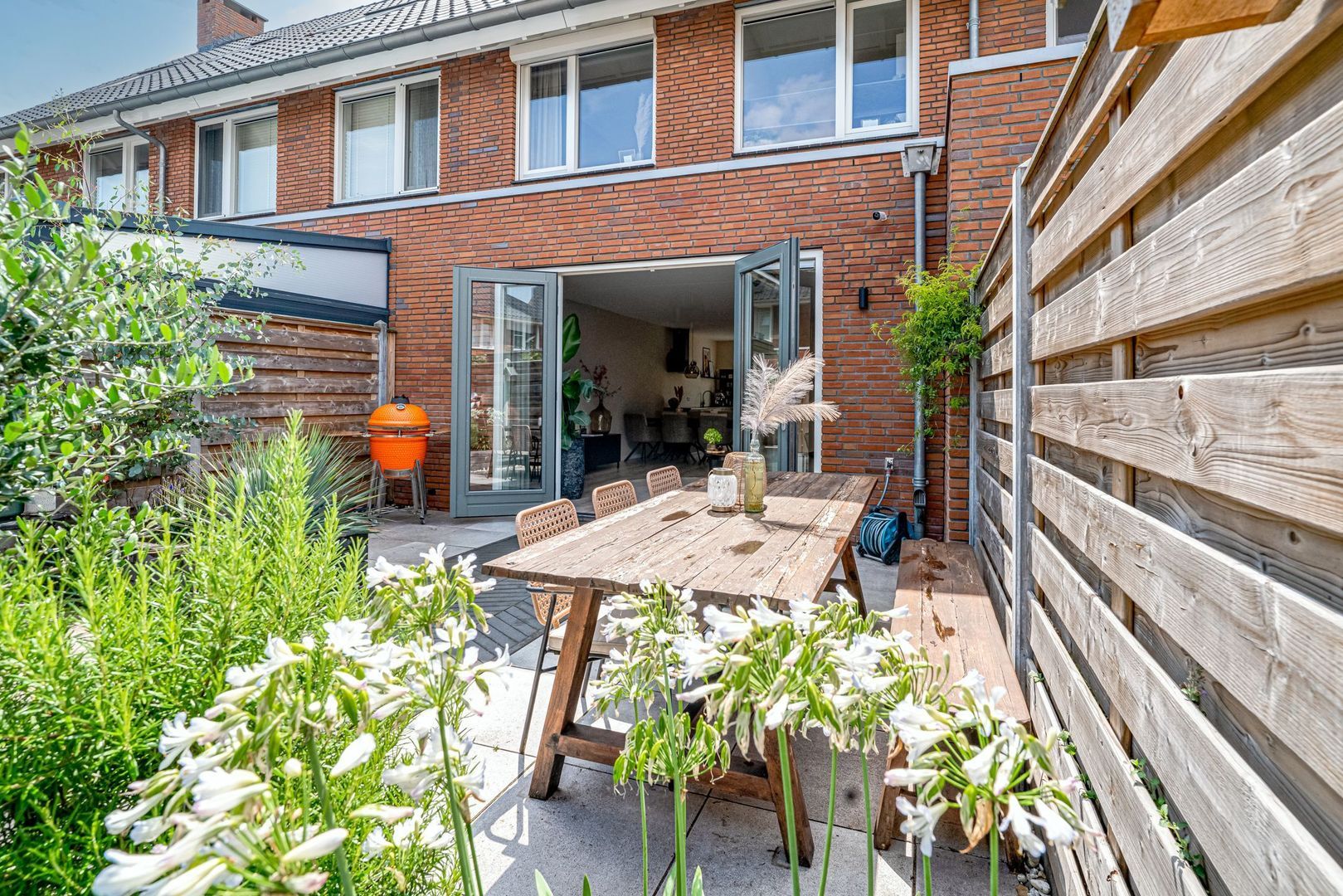 Middels de openslaande deuren kom je in de zonnige tuin met een groot terras waar je heerlijk kunt loungen. Achter in de hoek op de bruine bank kun je fijn genieten van de avondzon. Er is een berging aanwezig met hiernaast de poort naar het achtergelegen pad.