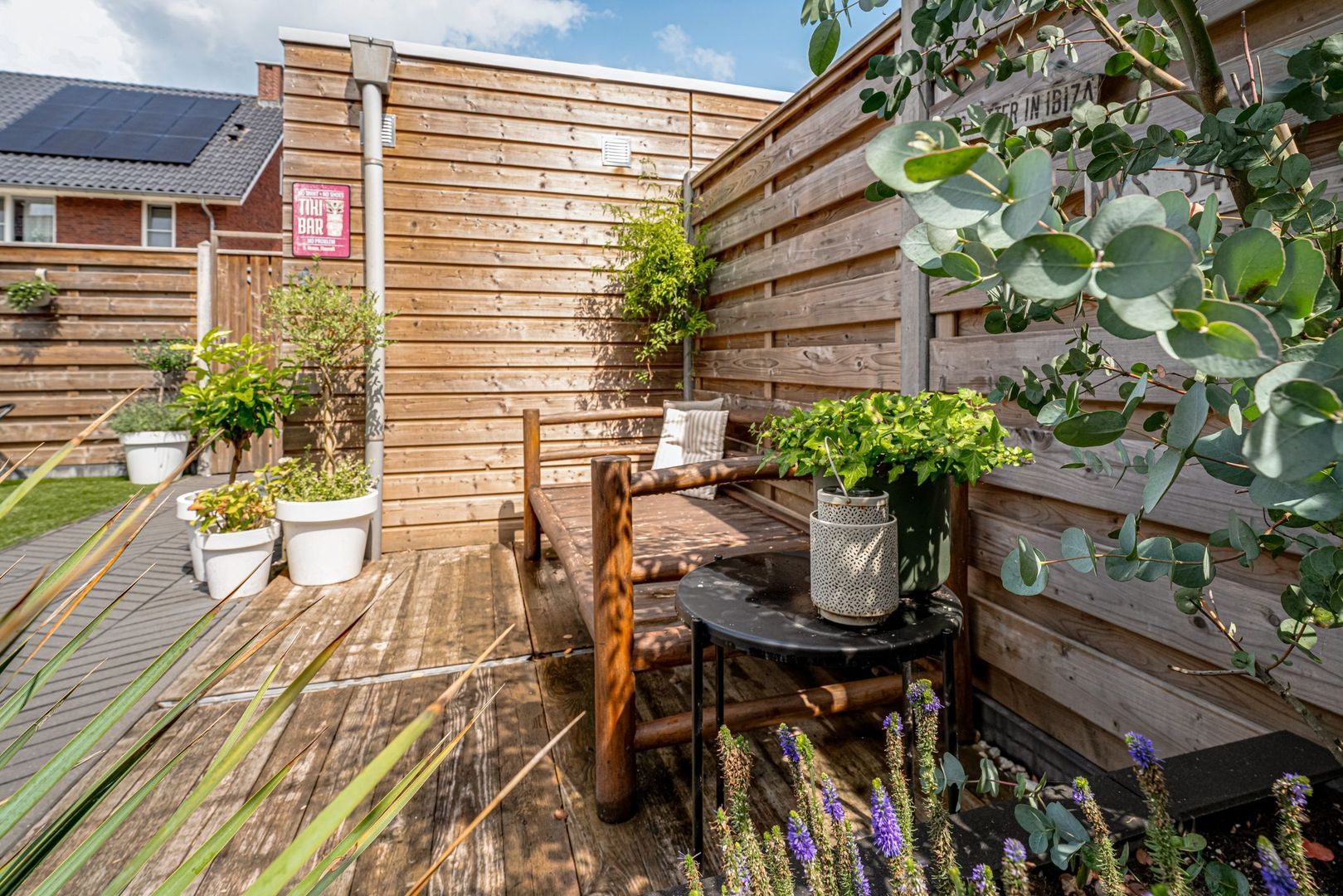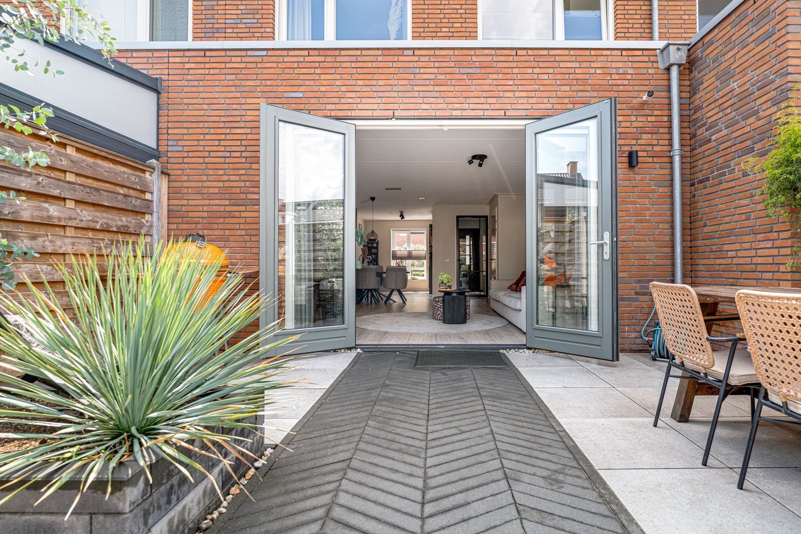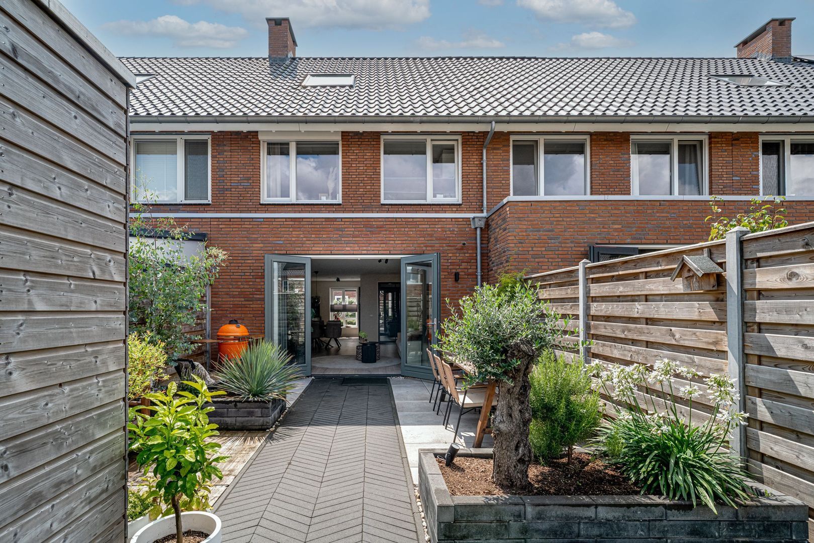 Middels de openslaande deuren kom je in de zonnige tuin met een groot terras waar je heerlijk kunt loungen. Achter in de hoek op de bruine bank kun je fijn genieten van de avondzon. Er is een berging aanwezig met hiernaast de poort naar het achtergelegen pad.