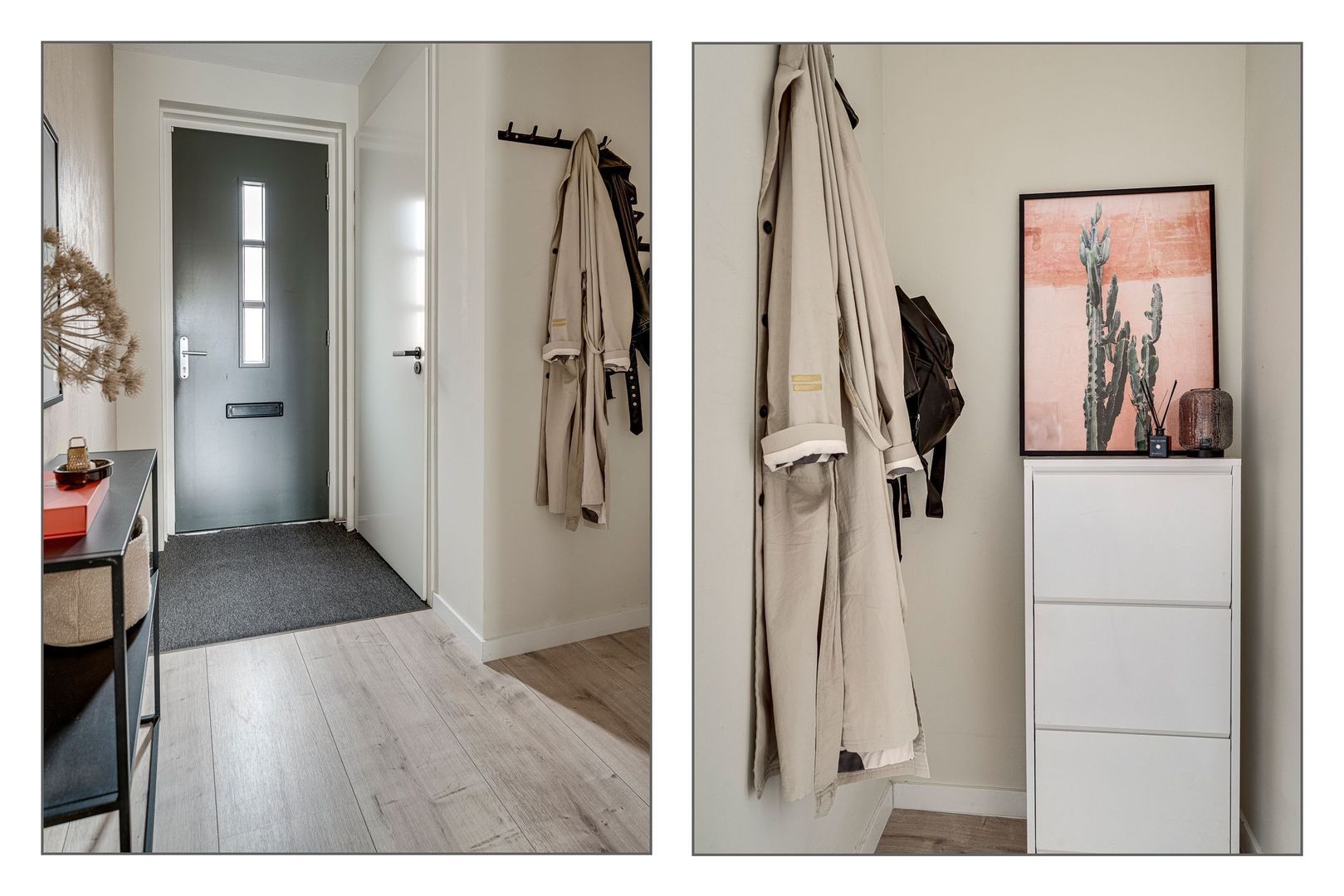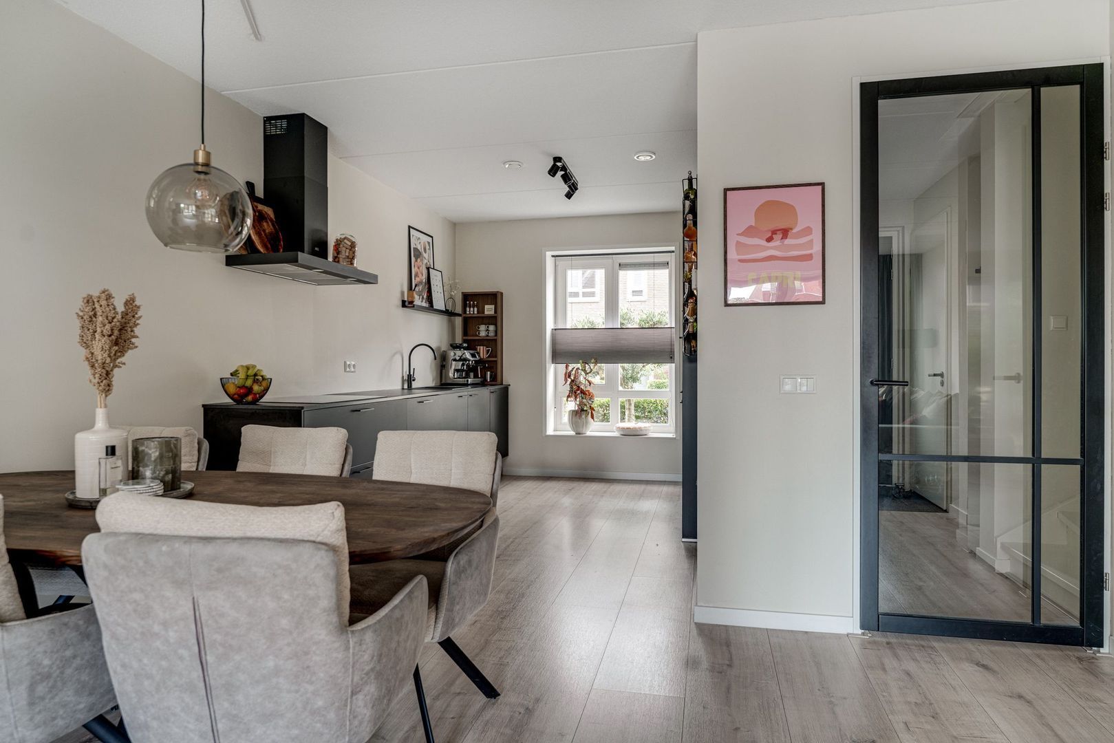 Entree van de woning in de hal. De hal is voorzien van het toilet met fonteintje, de meterkast en de trapopgang. Vanuit de hal kom je in de woonruimte, deze is opgedeeld in een open keuken met een woonkamer aan de tuinzijde. De luxe, open keuken is voorzien van 2 royale blokken waarbij er een kastenwand is met een grote koelkast en de combimagnetron. Aan de andere kant vindt je de inductiekookplaat met afzuigkap , een vaatwasser en in de hoek de gezellige “koffiecorner”. De ramen in het midden zorgen voor een sfeervol effect in de keuken en een goed lichtinval. De eethoek geeft een leuke scheiding tussen de keuken en de woonkamer. De zithoek is gesitueerd met zicht op de tuin met openslaande deuren naar het terras. De begane grond is voorzien van vloerverwarming met een laminaatvloer.