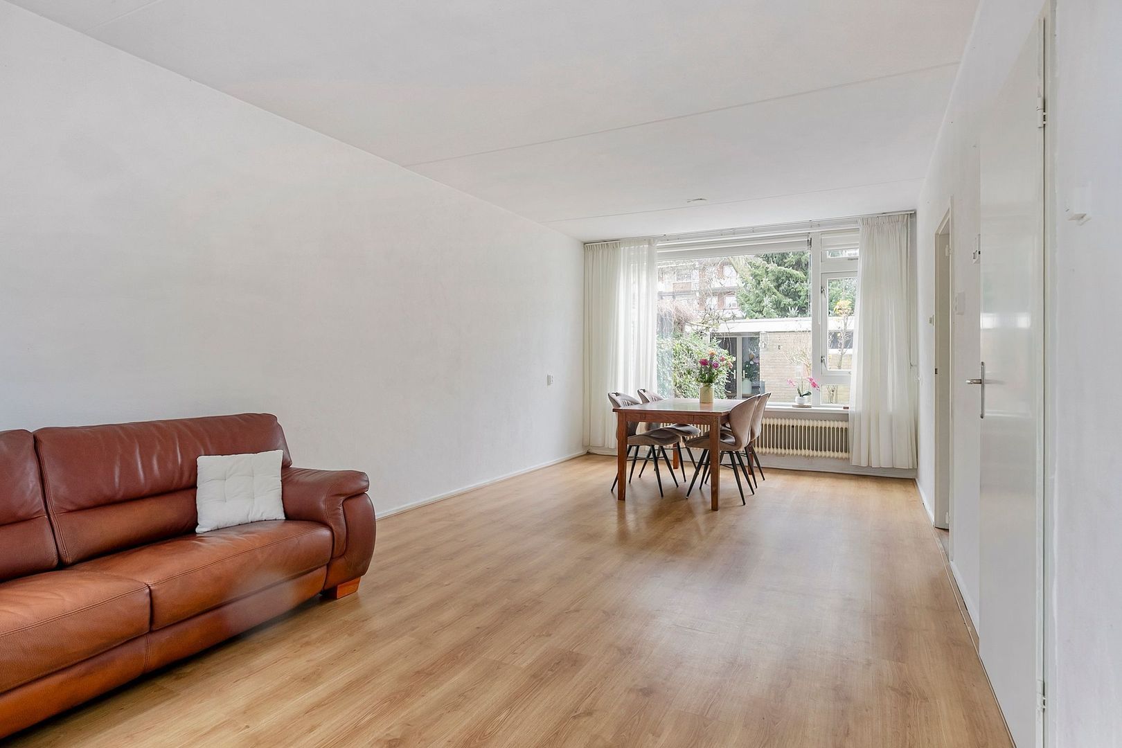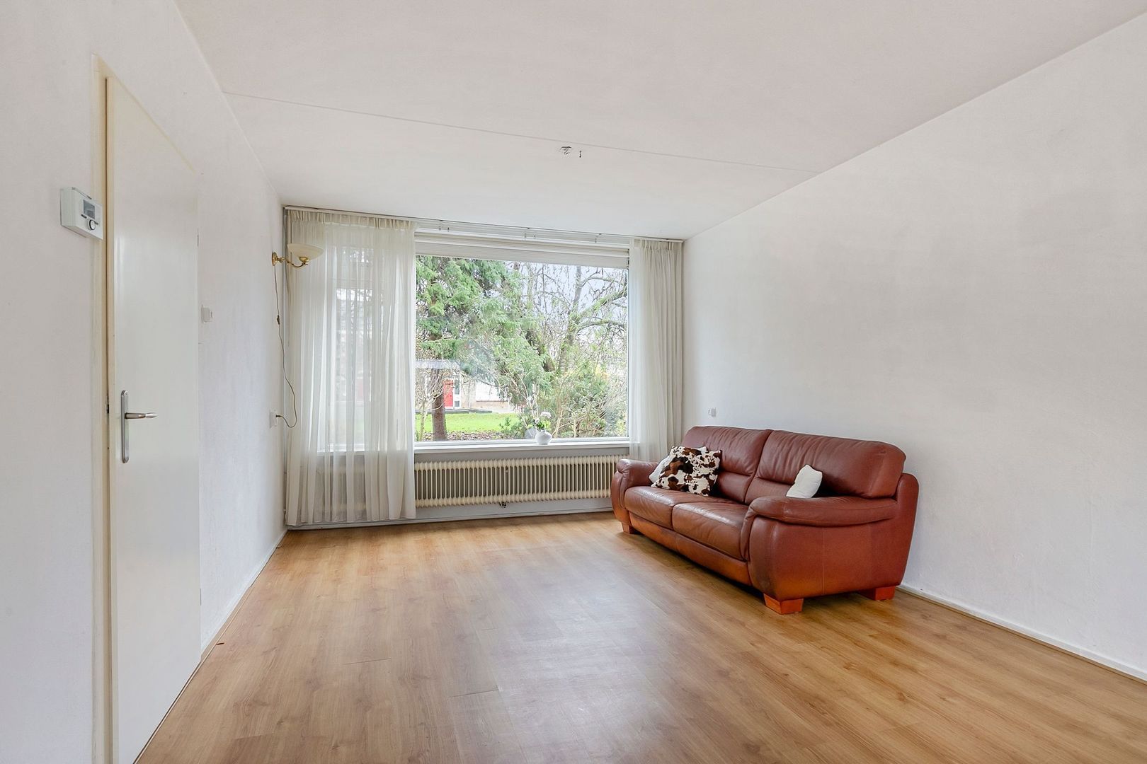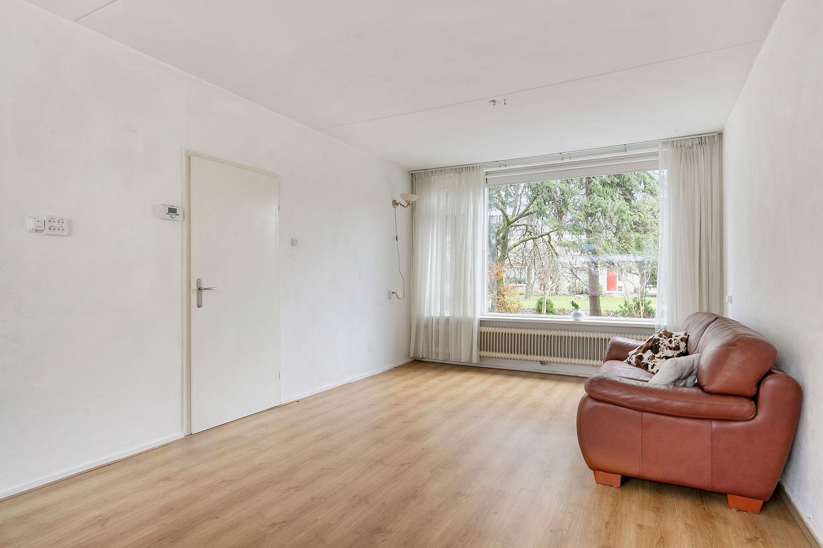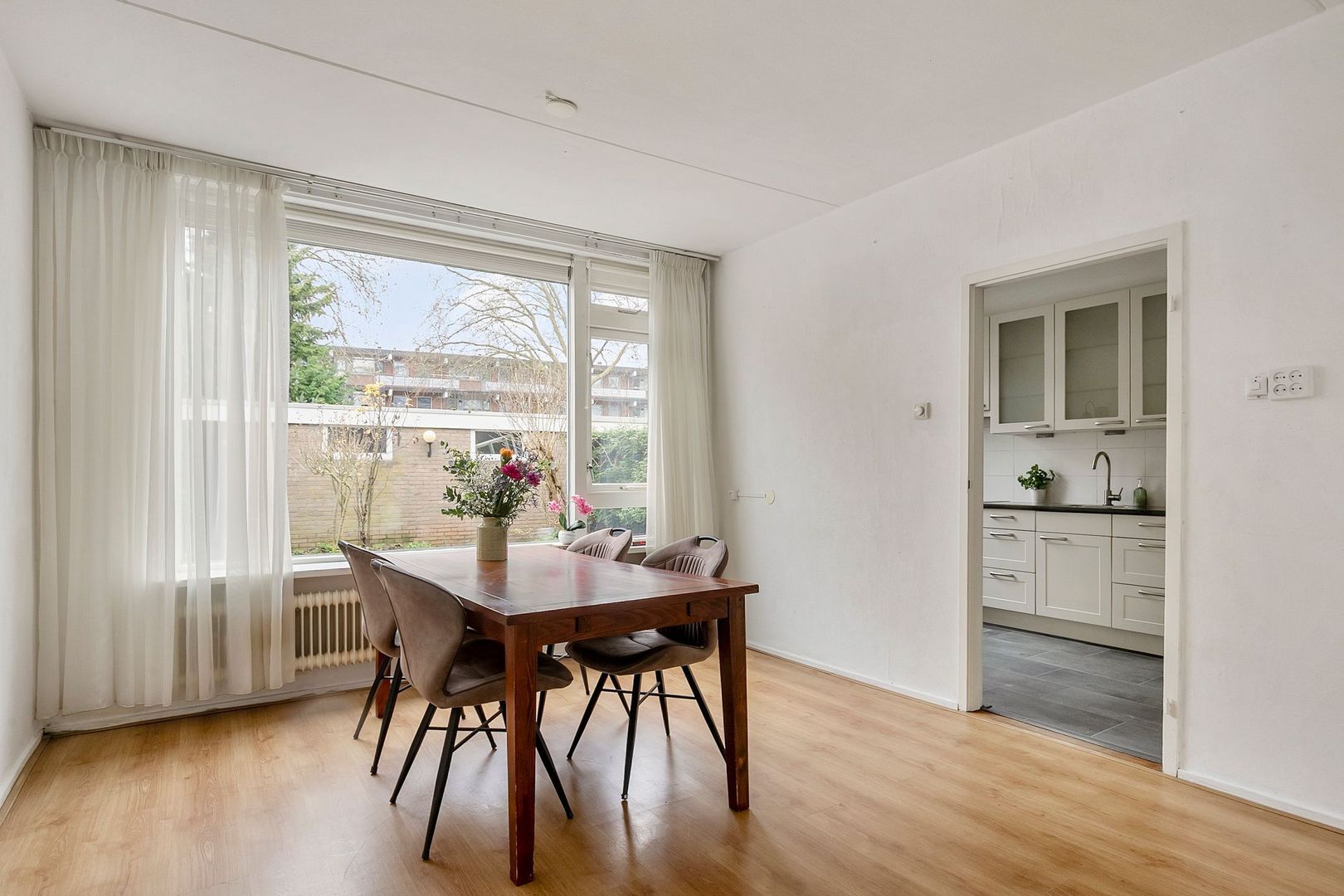 De woonkamer heeft een rechte opstelling waarbij de zithoek aan de voorzijde een rustige ligging heeft met vrij uitzicht op een grasveld. De eethoek is aan de achterzijde naast de keuken. Vanuit de keuken is er toegang naar de woonkamer en vanuit de woonkamer is er ook weer toegang naar de hal.