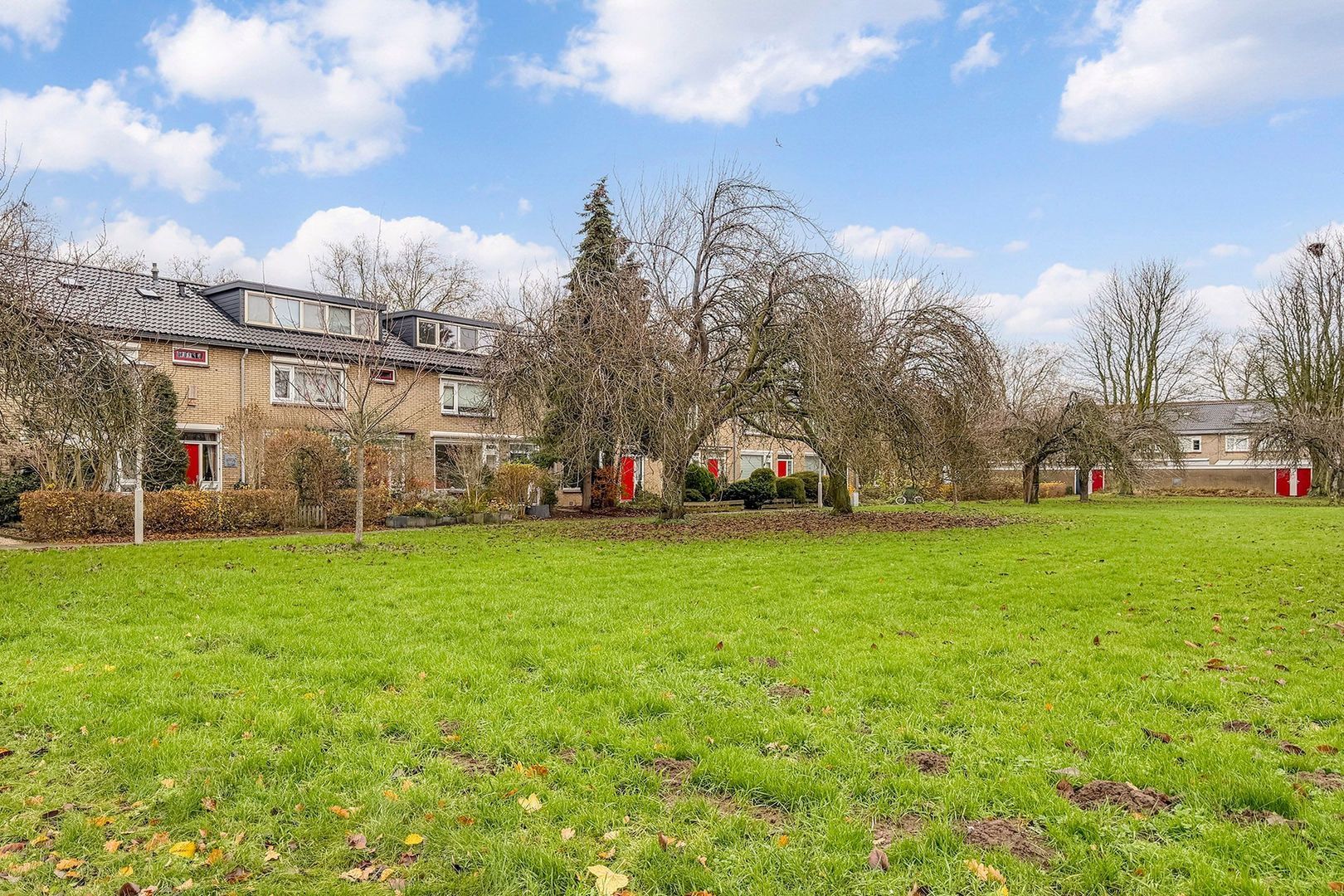 De voorzijde ligt rustig en vrij aan een grasveld en als je die oversteekt is er op het volgende veld een speeltuin voor de kleintjes.