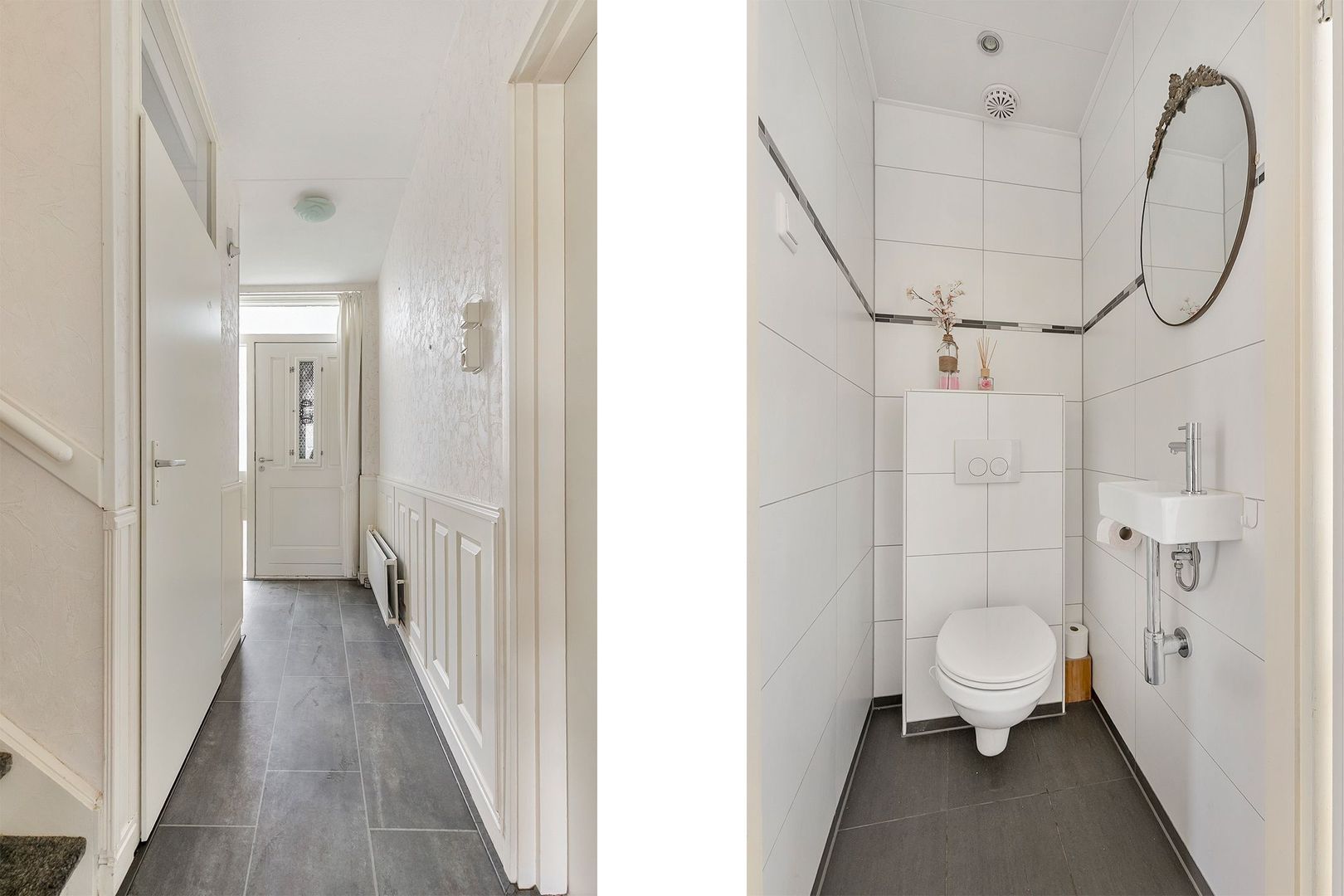 Entree in de hal, de hal is voorzien van het toilet met fonteintje, meterkast, trapopgang, de woonkamer en de keuken. De keuken is nagenoeg dicht te noemen en voorzien van een recht keukenblok met diverse inbouwapparatuur zoals een inductiekookplaat met afzuigkap, een koelkast en een combimagnetron. De keuken geeft toegang tot de tuin.