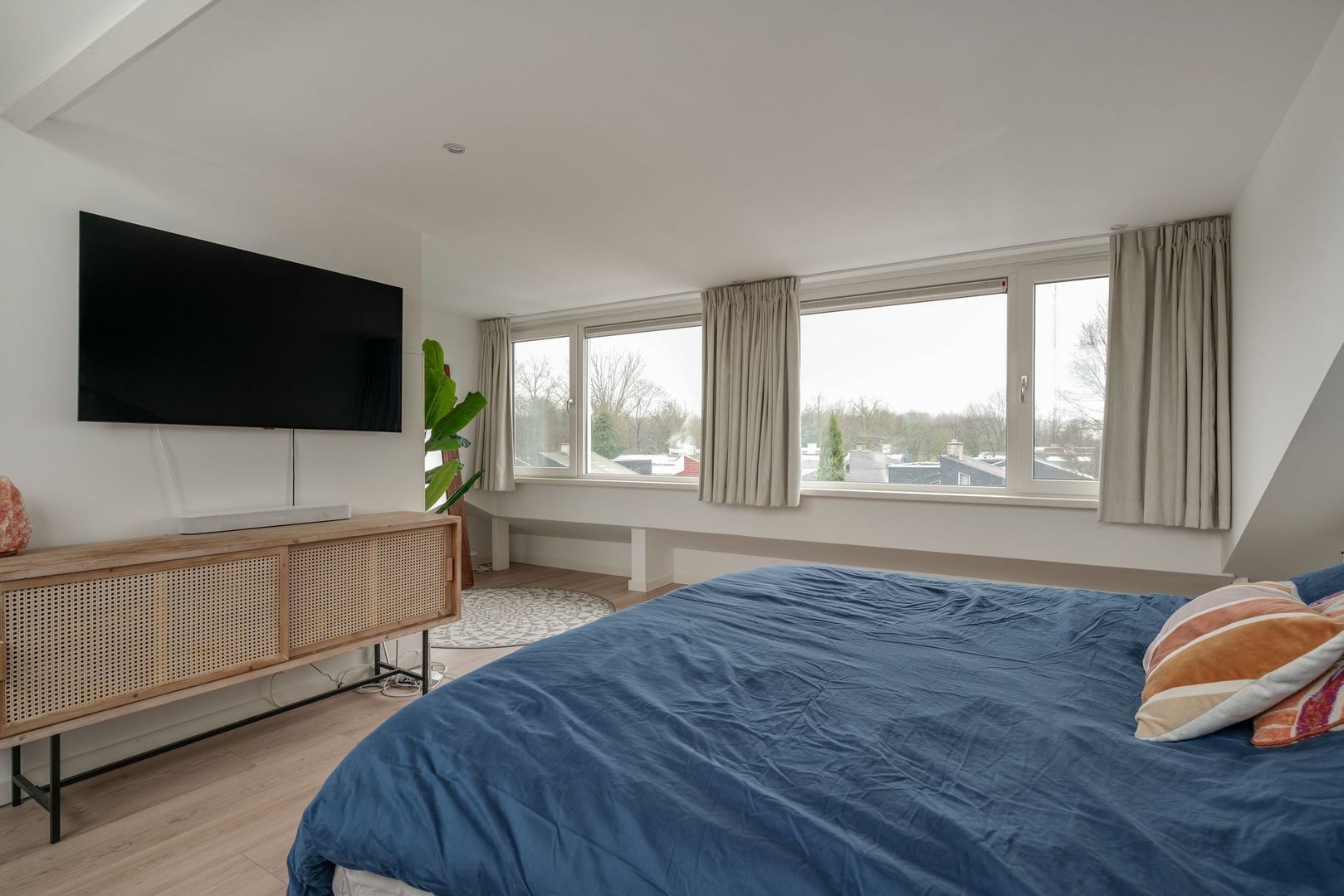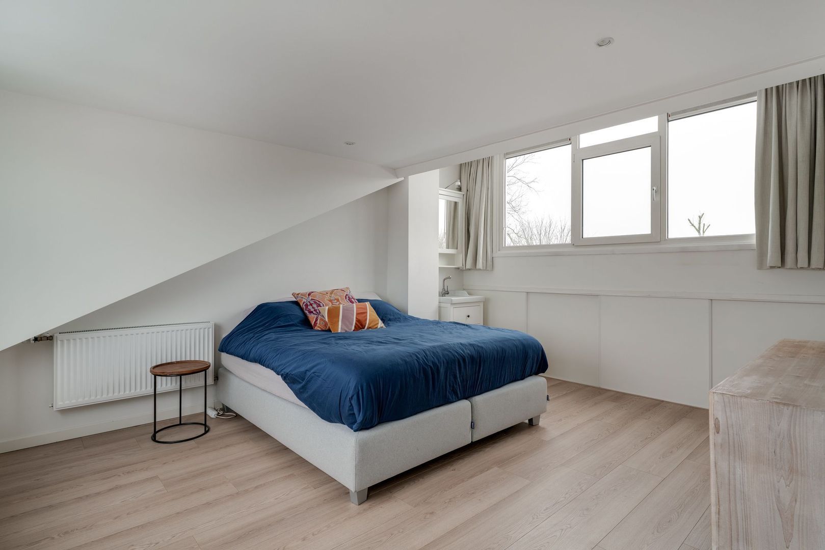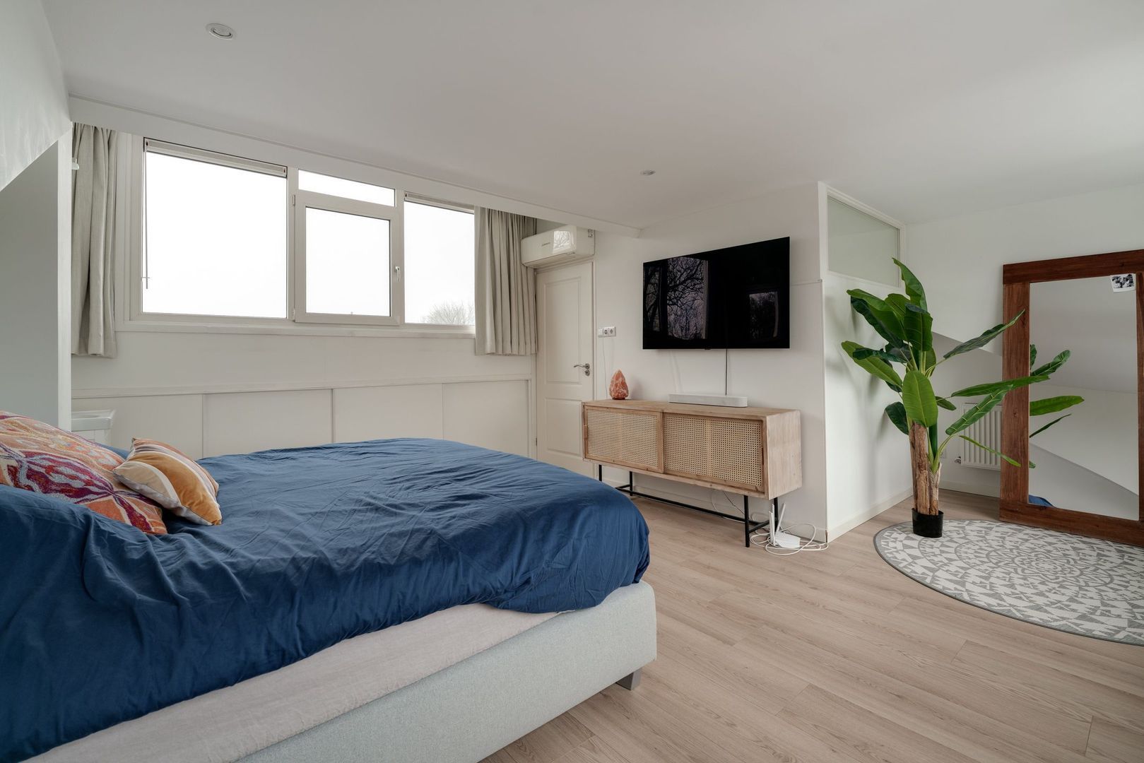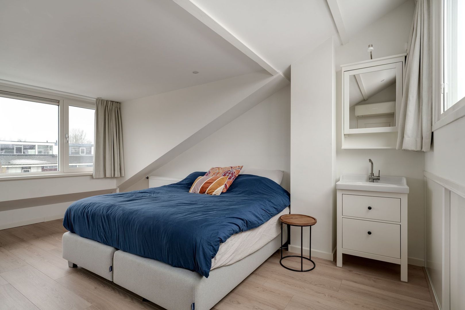 Op de overloop van deze verdieping is eerst de opstelling van de hybride c.v. ketel (2023) en de wasmachine met droger. vanuit de overloop kom je in een heerlijk, ruime ouderslaapkamer met airco en een zeer prettig lichtinval. Tevens is hier heel handig een wastafel met meubelombouw. Uiteraard bestaat hier de mogelijkheid 2 kleinere kamers te creëren.
