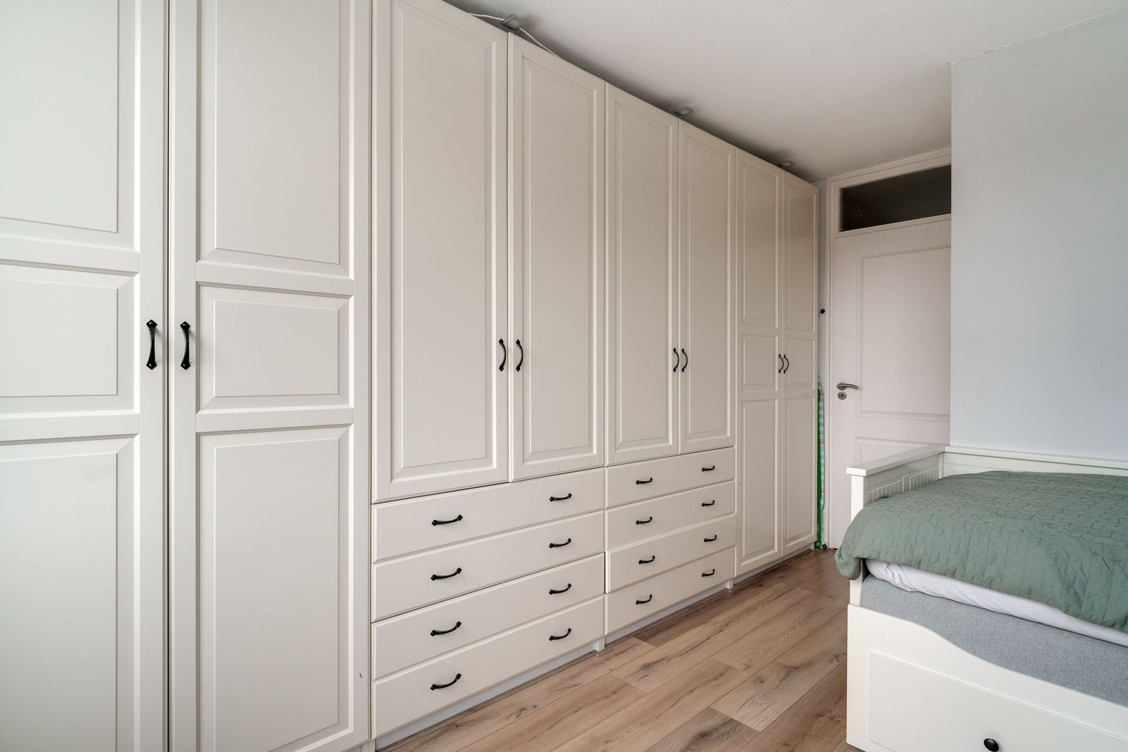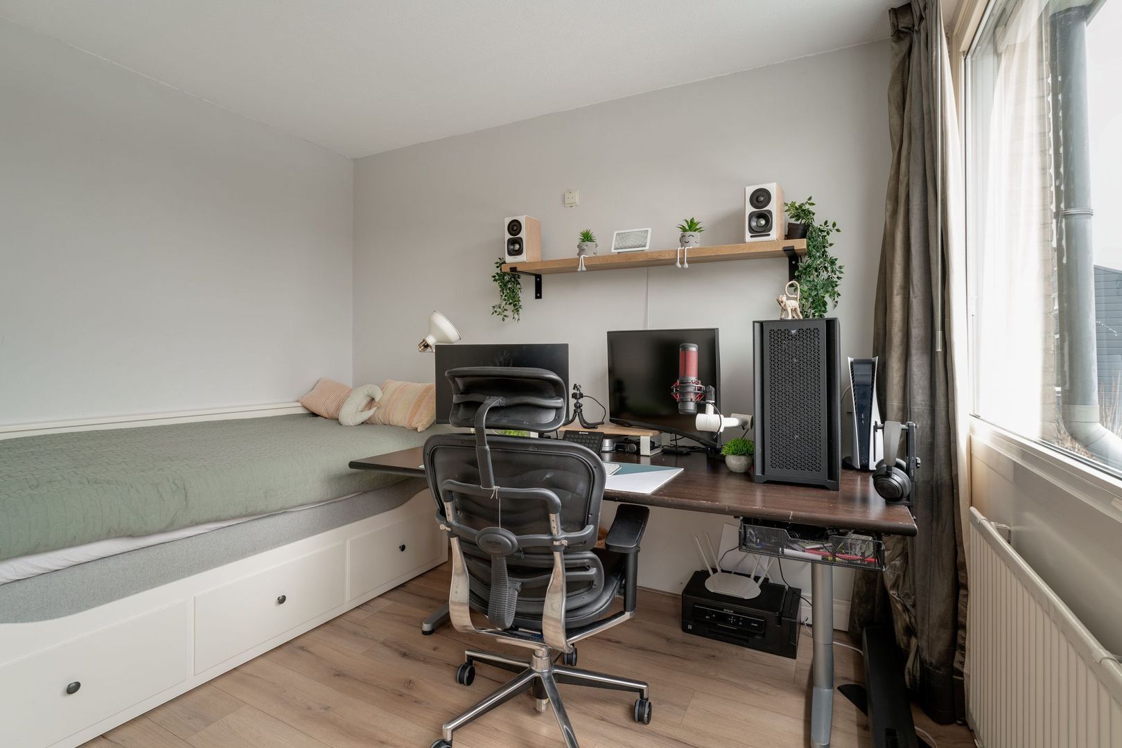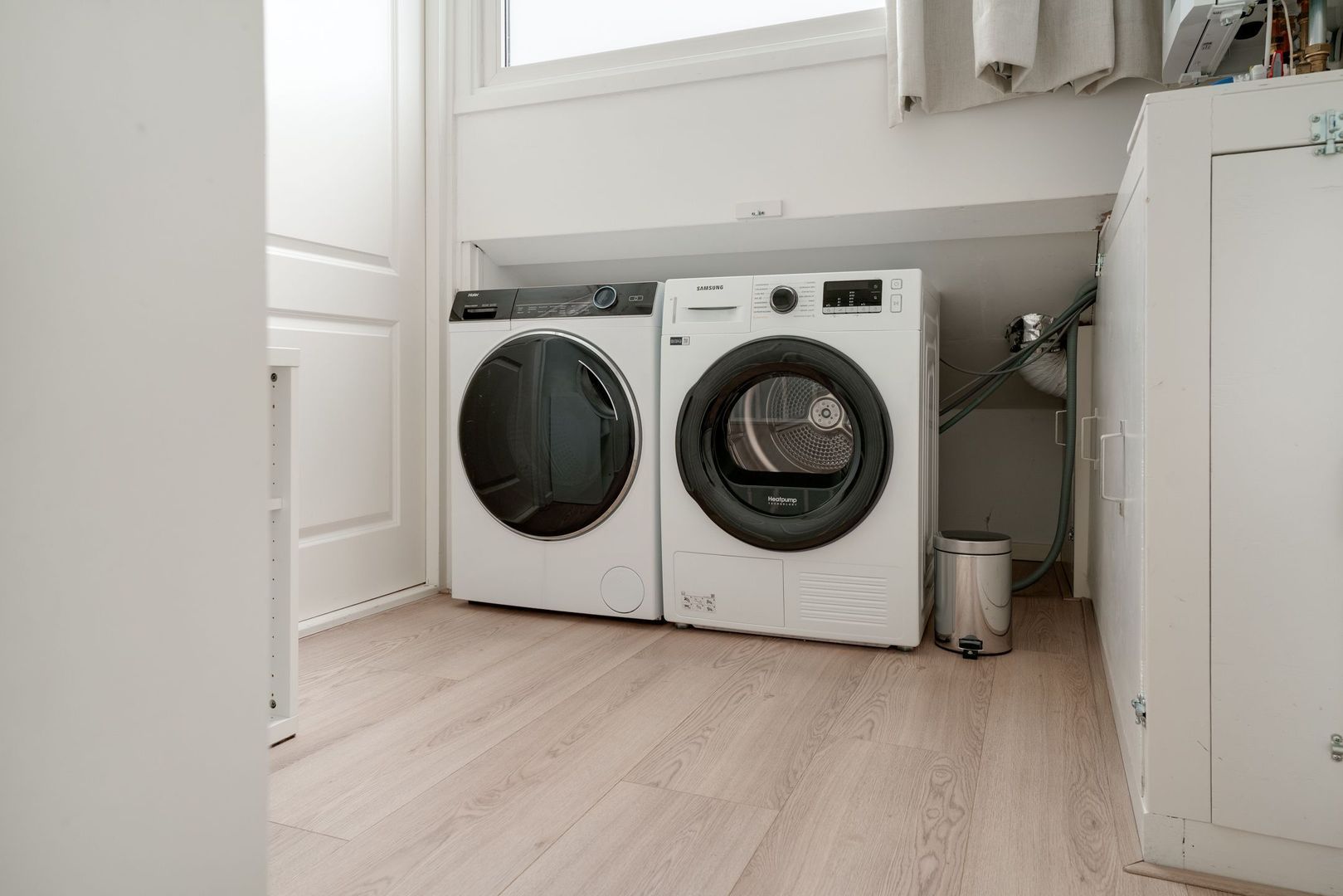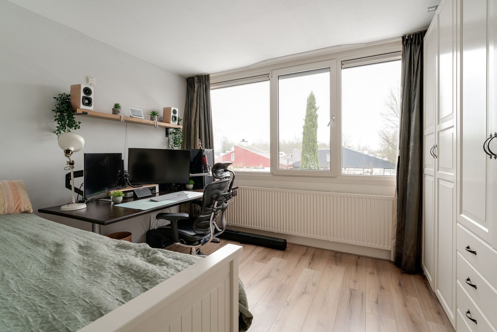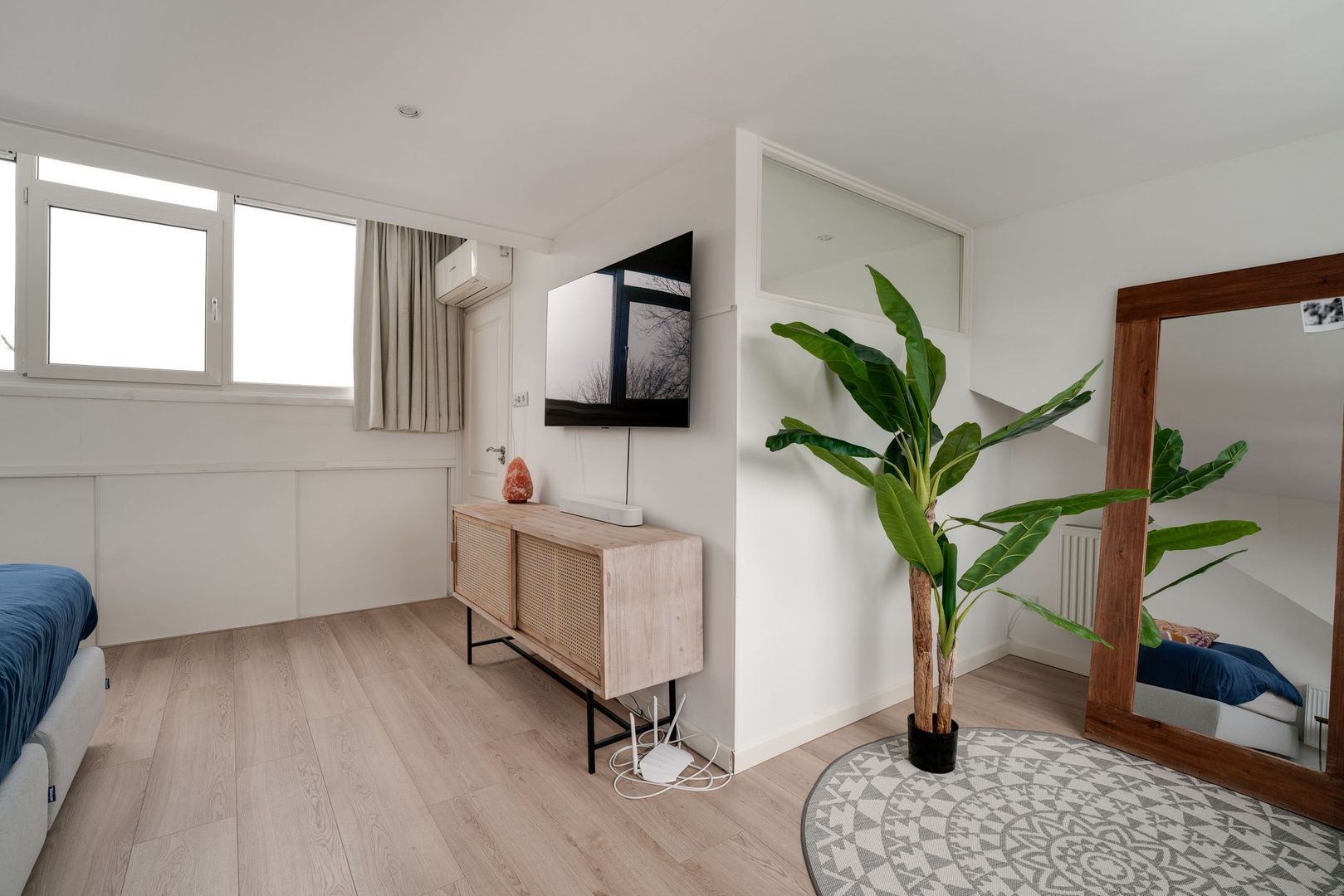 Op de overloop van deze verdieping is eerst de opstelling van de hybride c.v. ketel (2023) en de wasmachine met droger. vanuit de overloop kom je in een heerlijk, ruime ouderslaapkamer met airco en een zeer prettig lichtinval. Tevens is hier heel handig een wastafel met meubelombouw. Uiteraard bestaat hier de mogelijkheid 2 kleinere kamers te creëren.