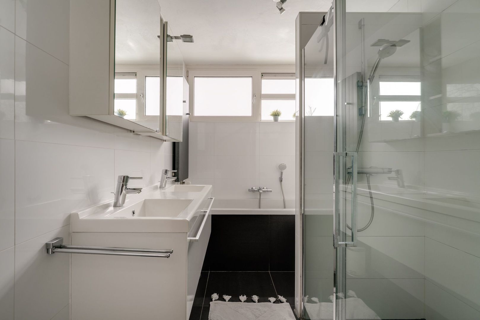 De overloop geeft toegang tot 3 slaapkamers en de badkamer. De moderne badkamer heeft een dubbele wastafel, een inloopdouche, het 2e toilet, vloerverwarming en een duo ligbad. Er zijn 2 slaapkamers aan de achterzijde en 1 slaapkamer aan de voorzijde, nu in gebruik als kinderslaapkamers en een werkkamer/logeerkamer.