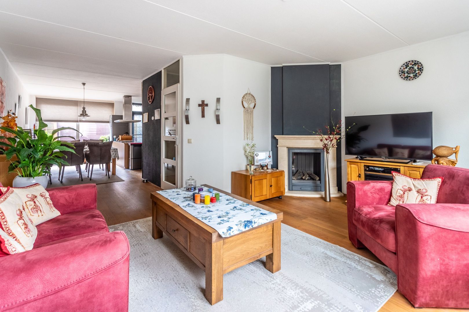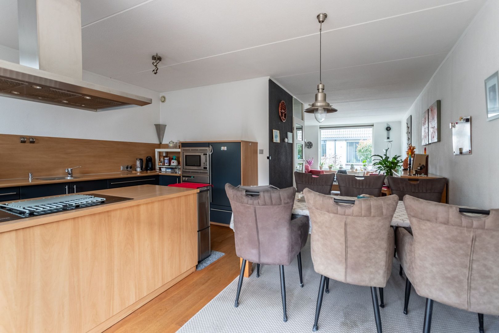 Via de entree kom je in de hal met toilet en trapopgang. De lichte woonkamer aan de voorzijde zorgt voor een prettige leefruimte. De woonkamer heeft een gezellige gashaard en is gesitueerd aan de voorzijde van het huis. Aan de achterzijde bevindt zich de ruime eetkamer met open keuken. Door de uitbouw aan de achterzijde is de keuken zeer ruim van opzet en nodigt hierdoor uit tot gezellig natafelen.
