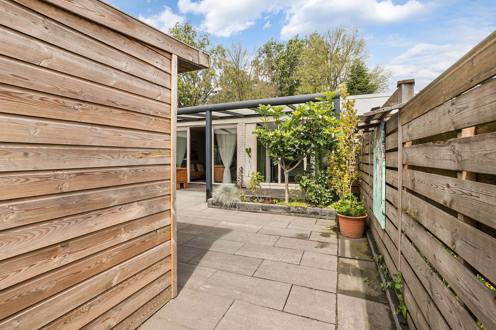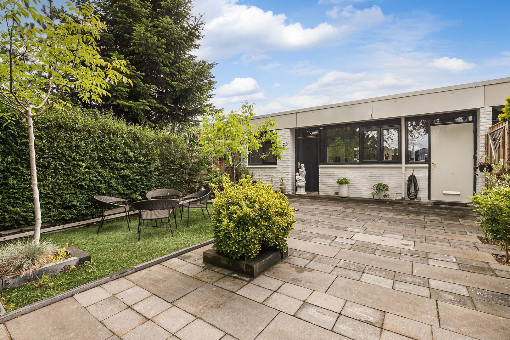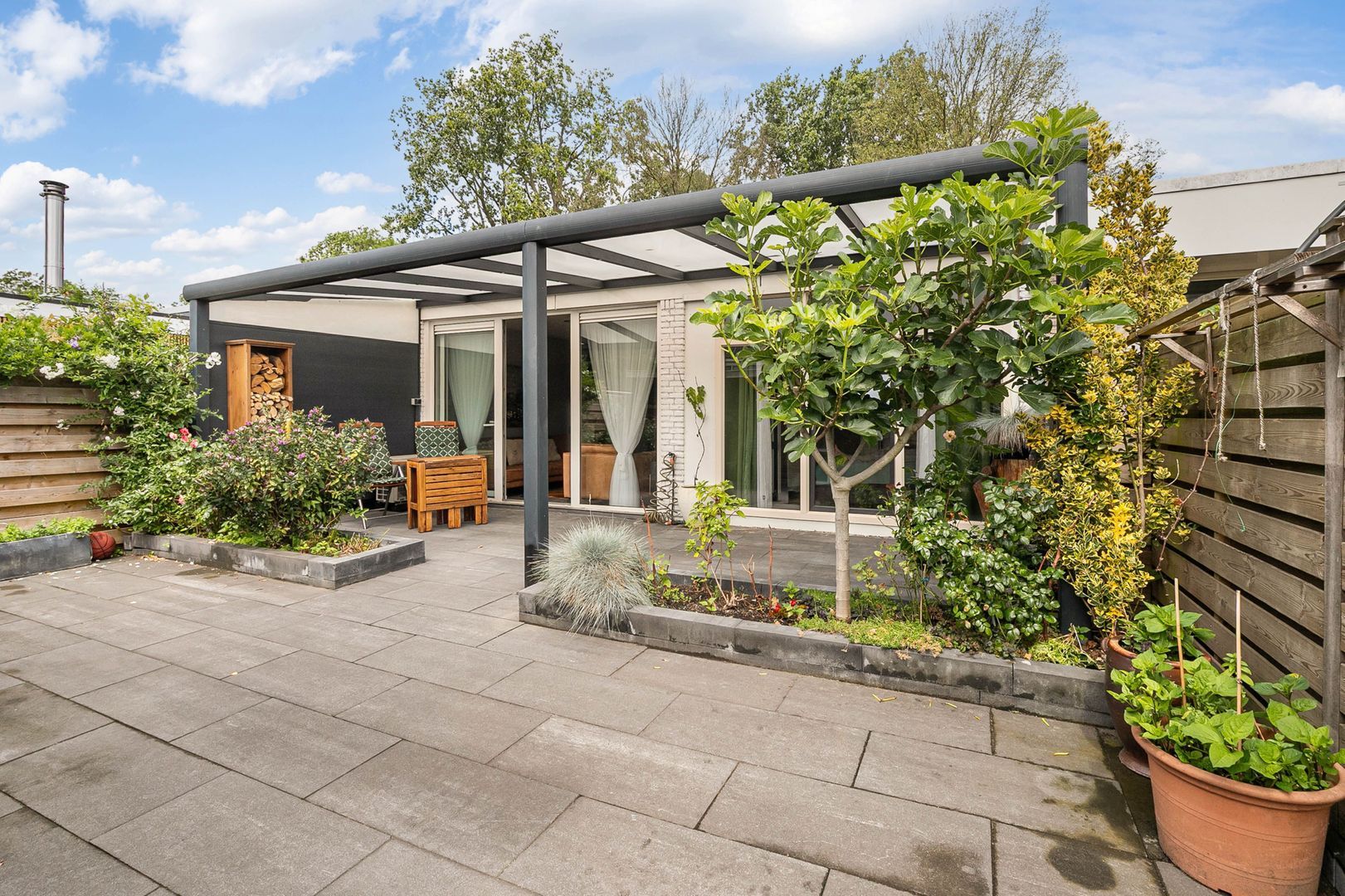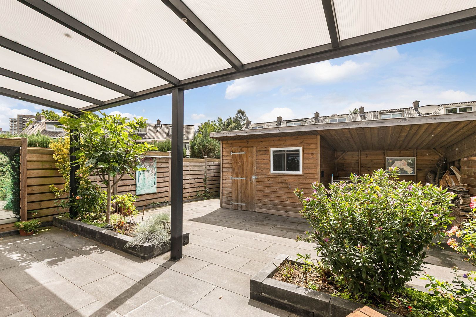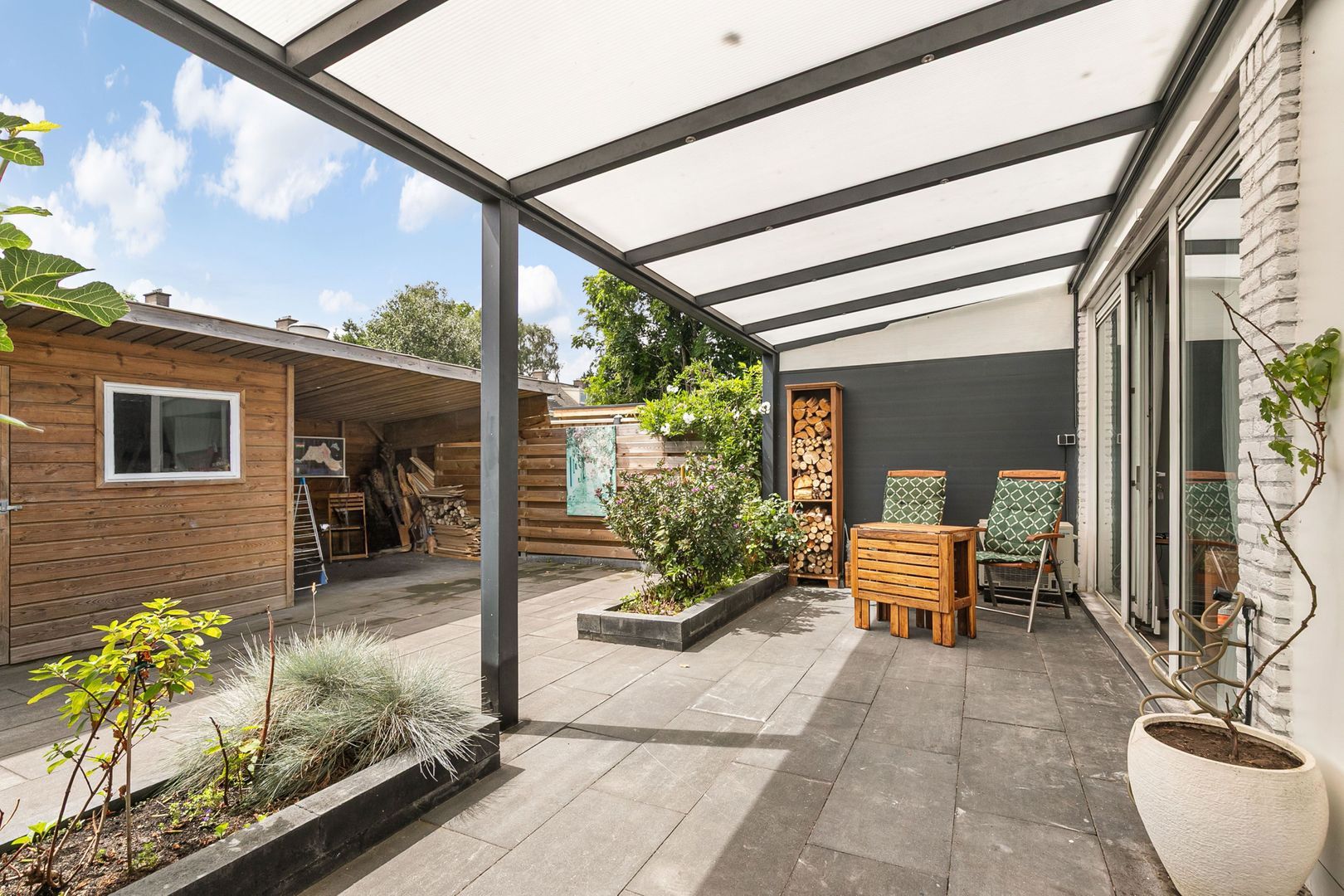 Aan de achterzijde is er over de gehele breedte een aluminium overkapping geplaatst met verlichting. Zowel de voortuin als de achtertuin zijn volledig opnieuw ingericht en aangelegd. De achtertuin is voorzien van een houten schuur met hiernaast nog een knusse overkapping.