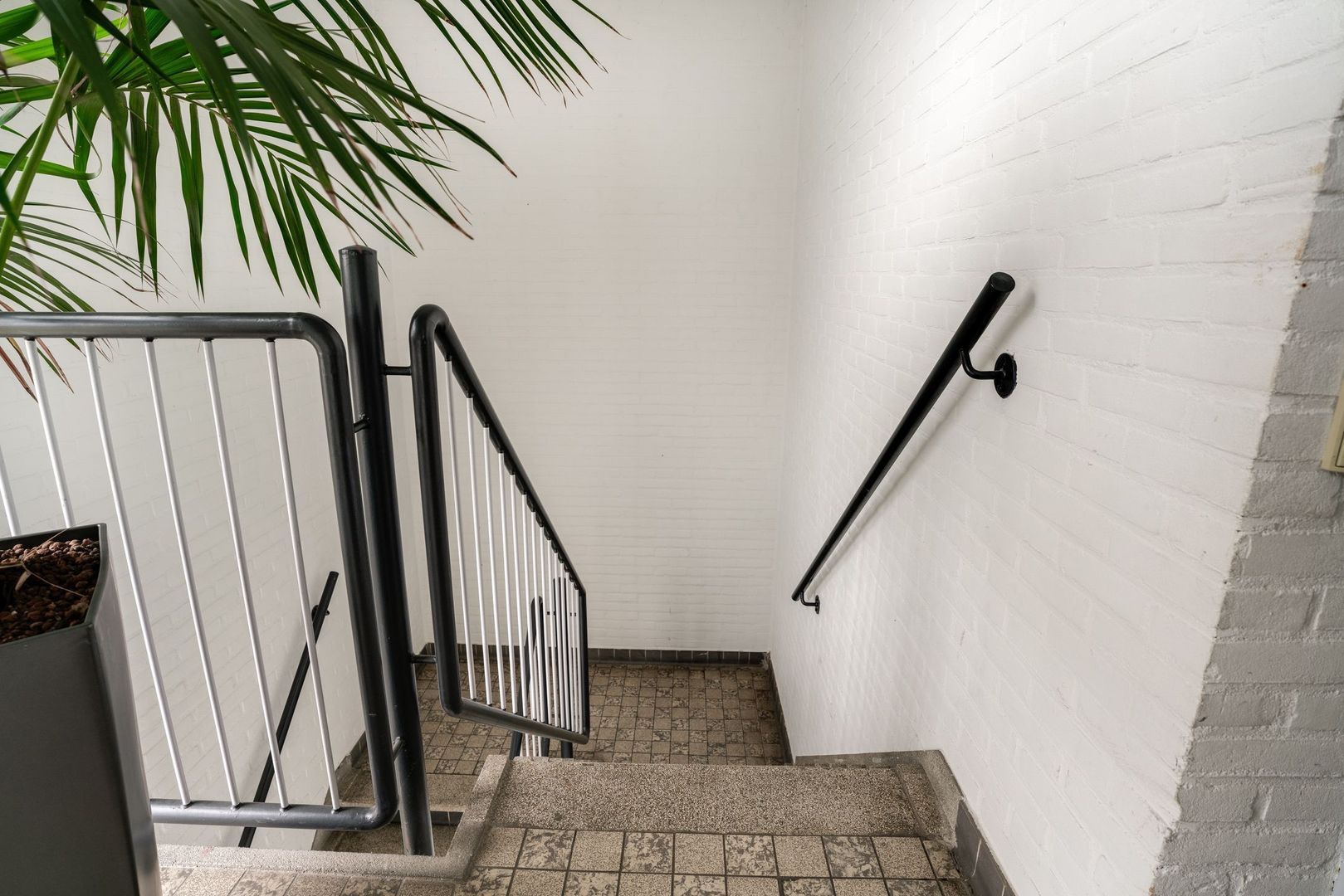 Afgesloten entree van het complex met een bellentableau en de brievenbussen. Vanuit de centrale hal is er toegang tot het trappenhuis, de lift en de bergingen.