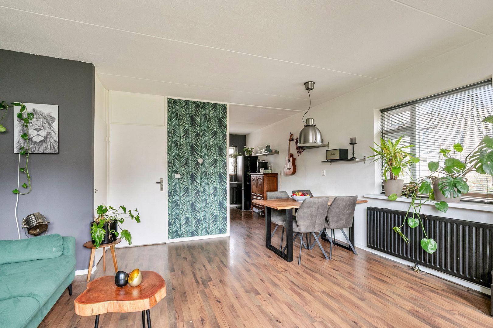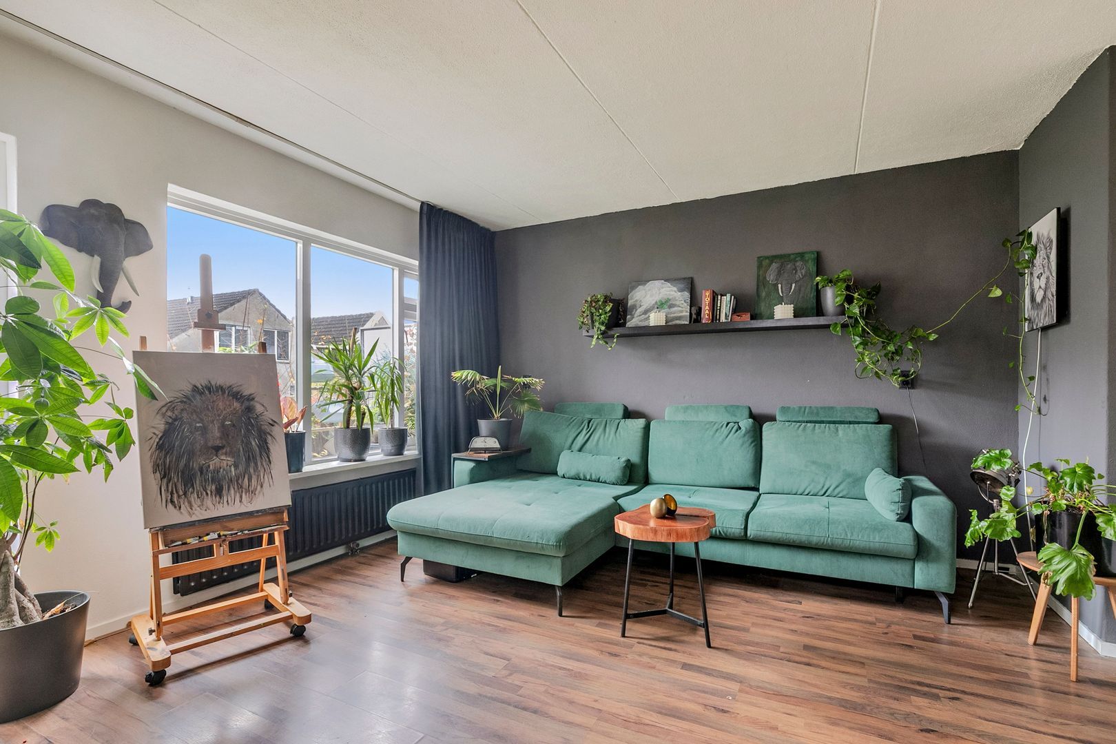 Entree van het appartement in de hal, de hal is voorzien van het moderne toilet met fonteintje, de trapopgang en de kast met de opstelling van de c.v. combiketel (2009). Vanuit de hal kom je in de woonkamer met open keuken. De woonkamer heeft toegang tot het zonnige balkon op het zuiden en er is een praktische trapkast met bergruimte. De open keuken heeft een recht keukenblok met diverse inbouwapparatuur zoals een vaatwasser, een gaskookplaat en een combimagnetron. Er is een losse koelkast met vriezer. De eethoek geeft een leuke verdeling tussen woonkamer en keuken. Deze verdieping is voorzien van een laminaatvloer.