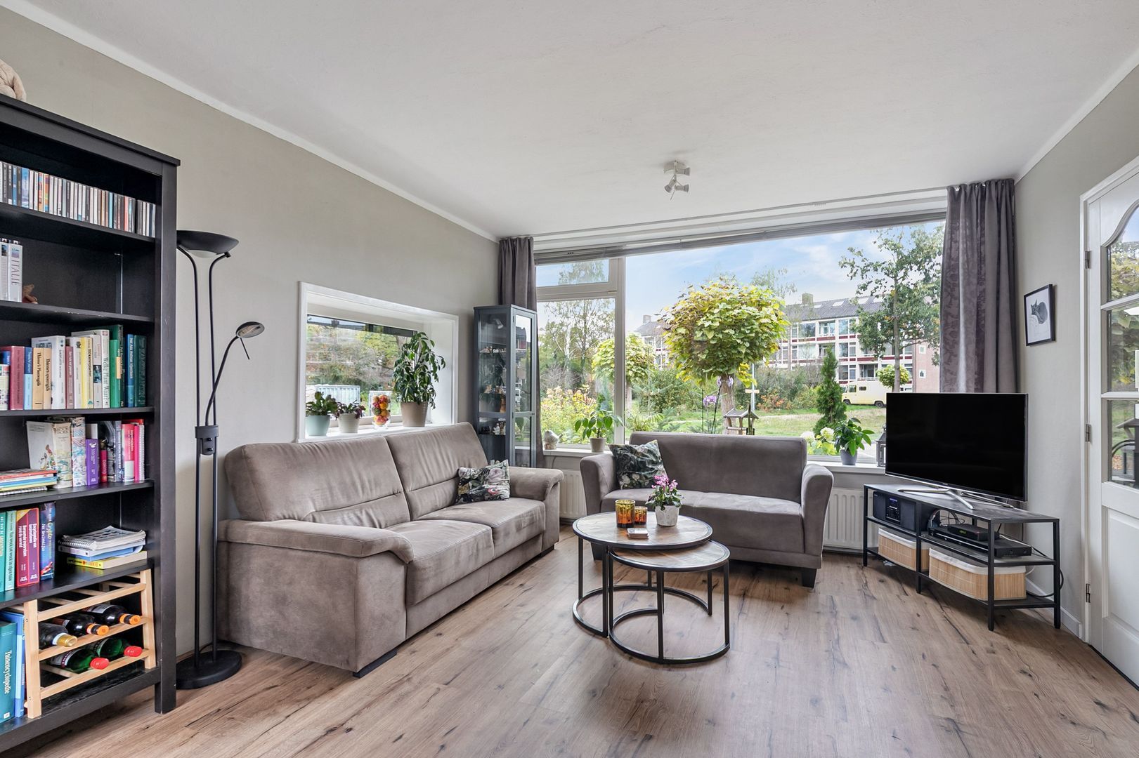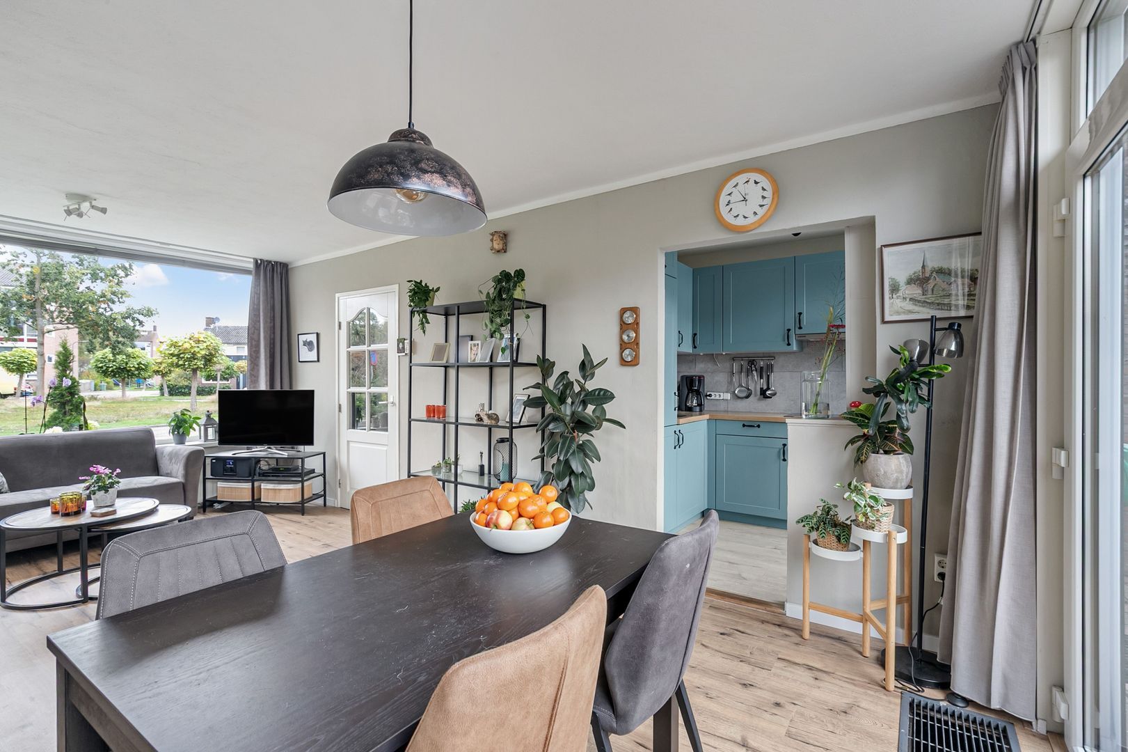 - Lichte woonkamer met geïsoleerde vloer en doorgang naar de keuken.