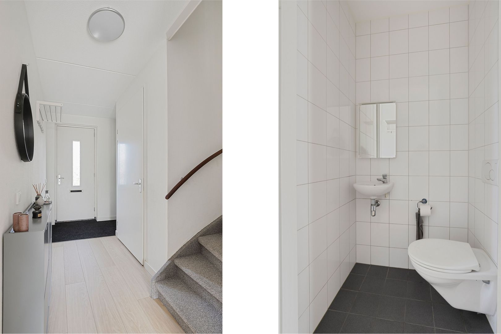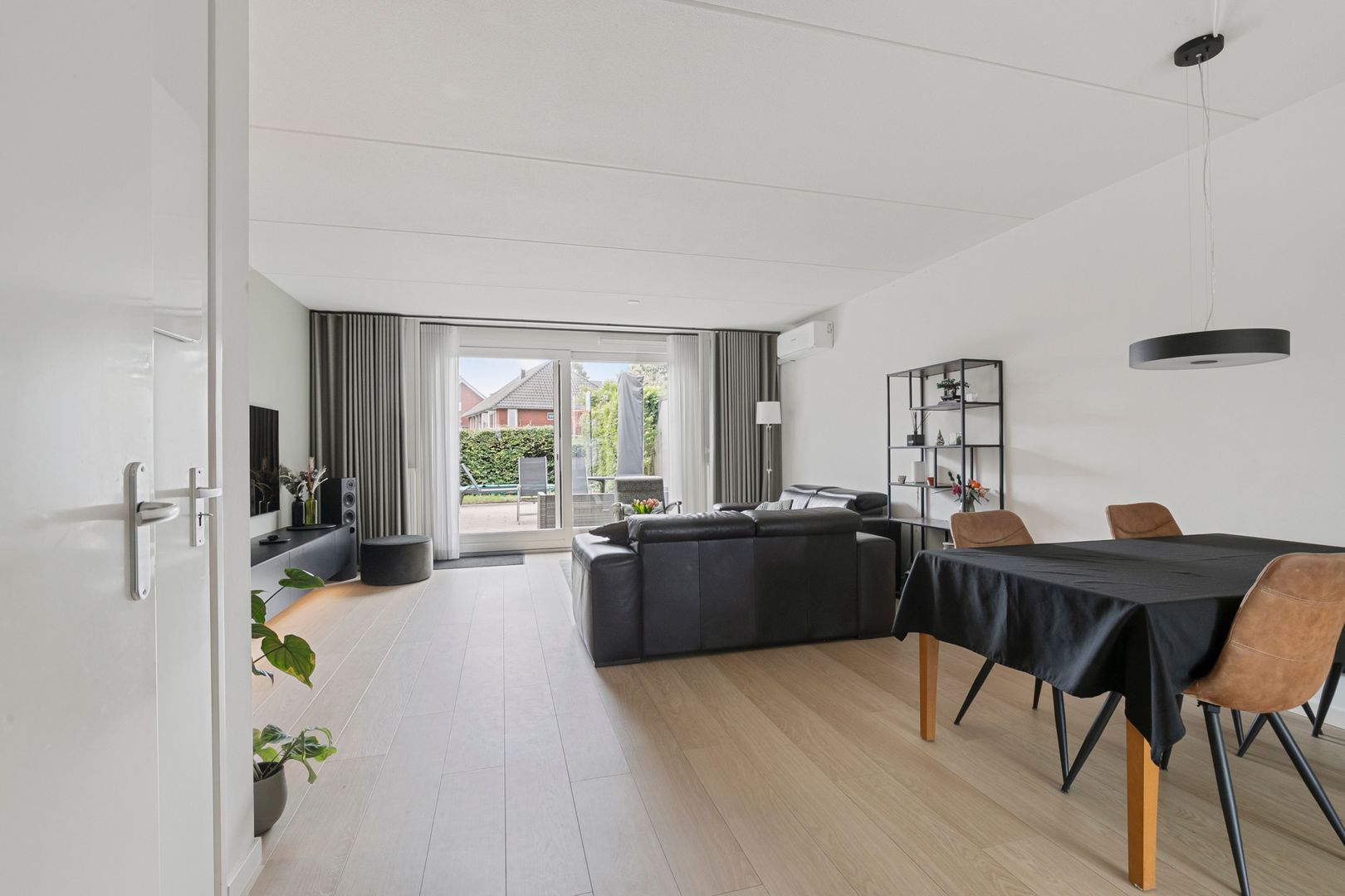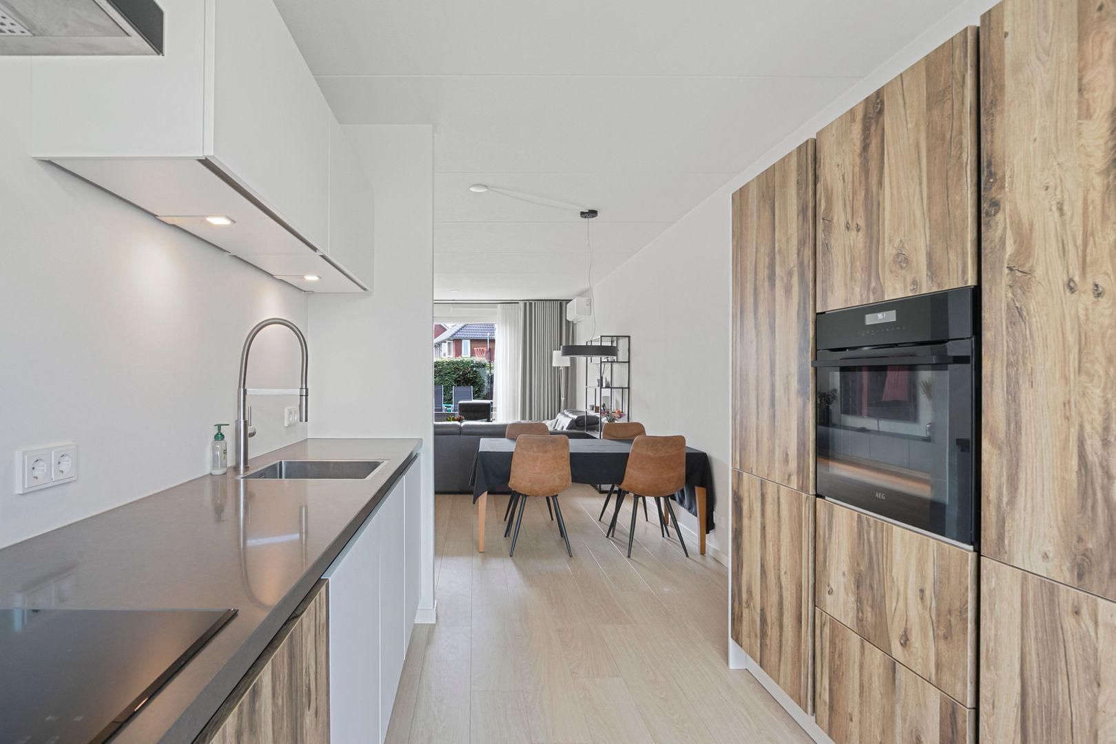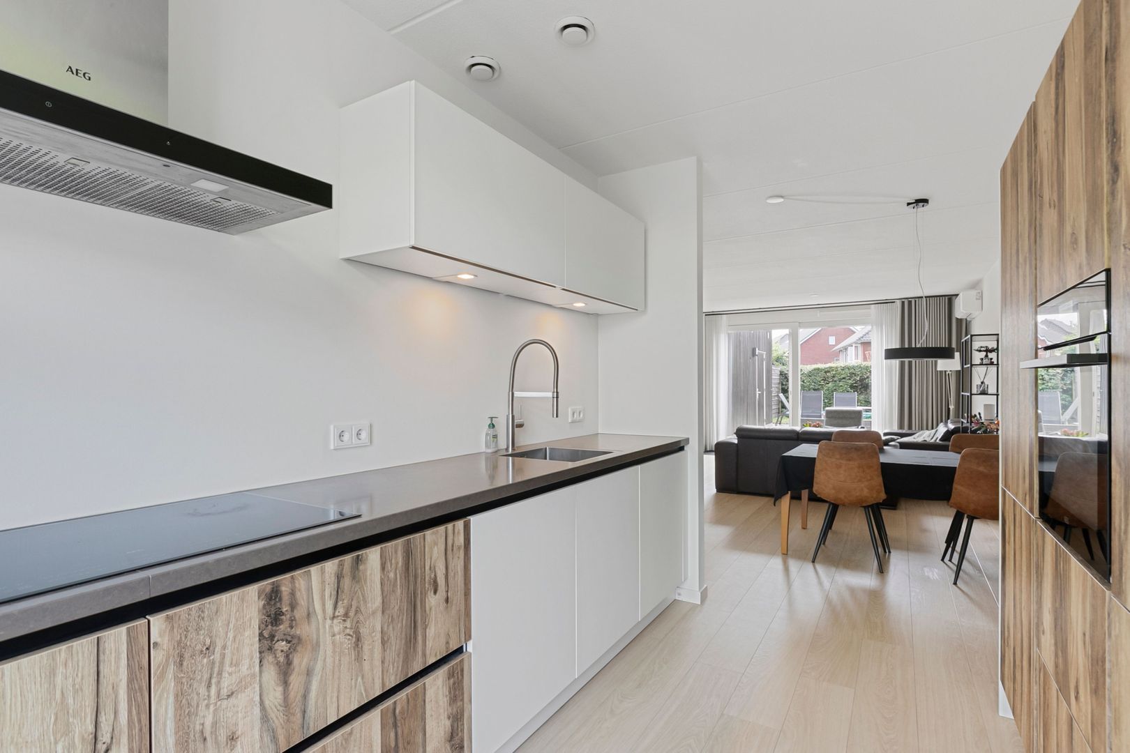 Entree van de woning in de hal. De hal is voorzien van het toilet met fonteintje, de meterkast, de trapopgang en er is ruimte voor de garderobe. Vanuit de hal kom je in de royale leefruimte welke is verdeeld in een ruime zithoek aan de tuinkant met schuifdeur naar het terras. Centraal staat de eethoek met in het verlengde de vernieuwde keuken (2019) voorzien van luxe AEG inbouwapparatuur zoals een inductiekookplaat, vaatwasser, oven, grote koelkast, vriezer en een afzuigkap. Tevens is de begane grond voorzien van een pvc vloer en een airco installatie (2024).