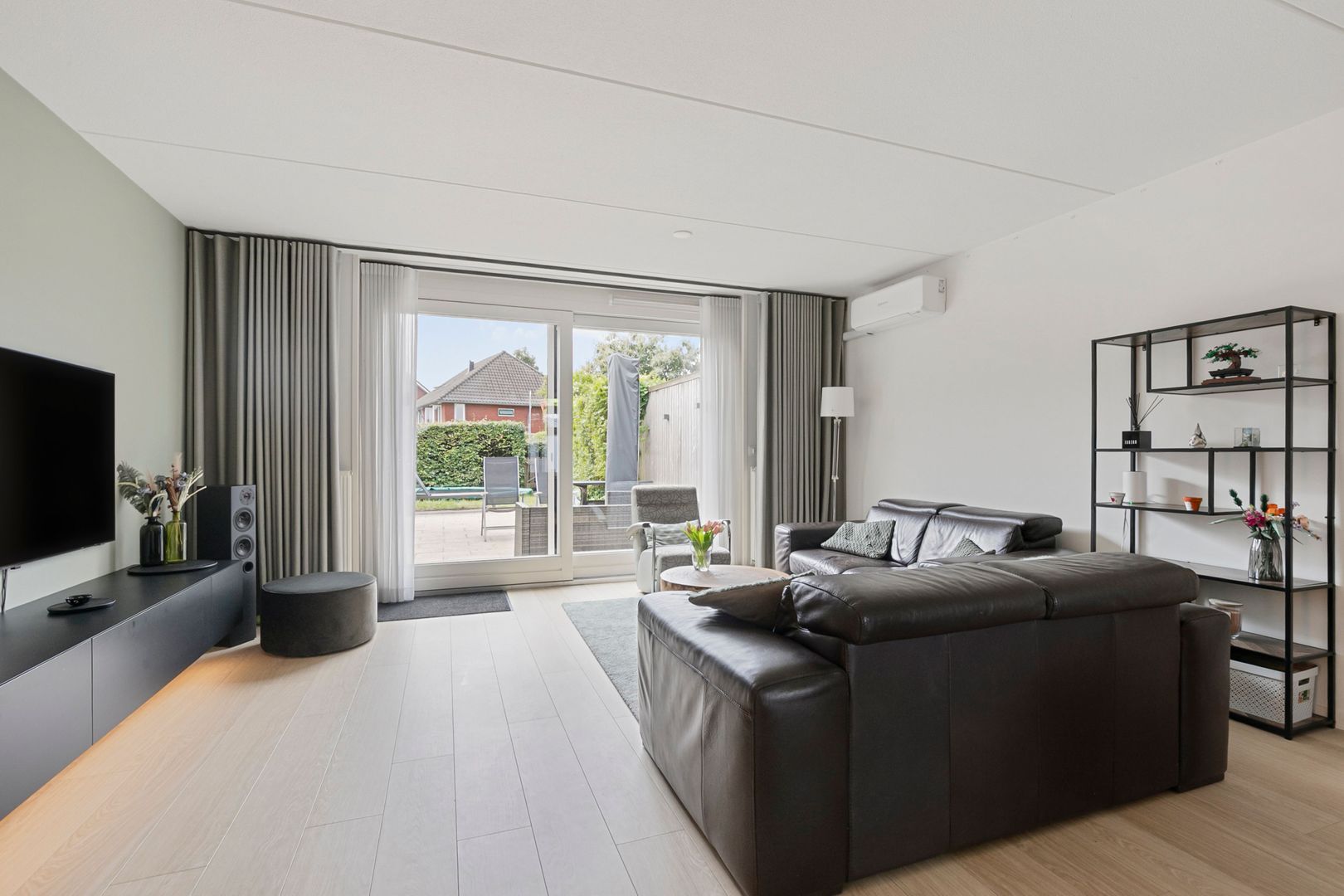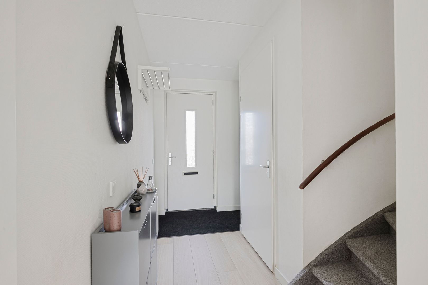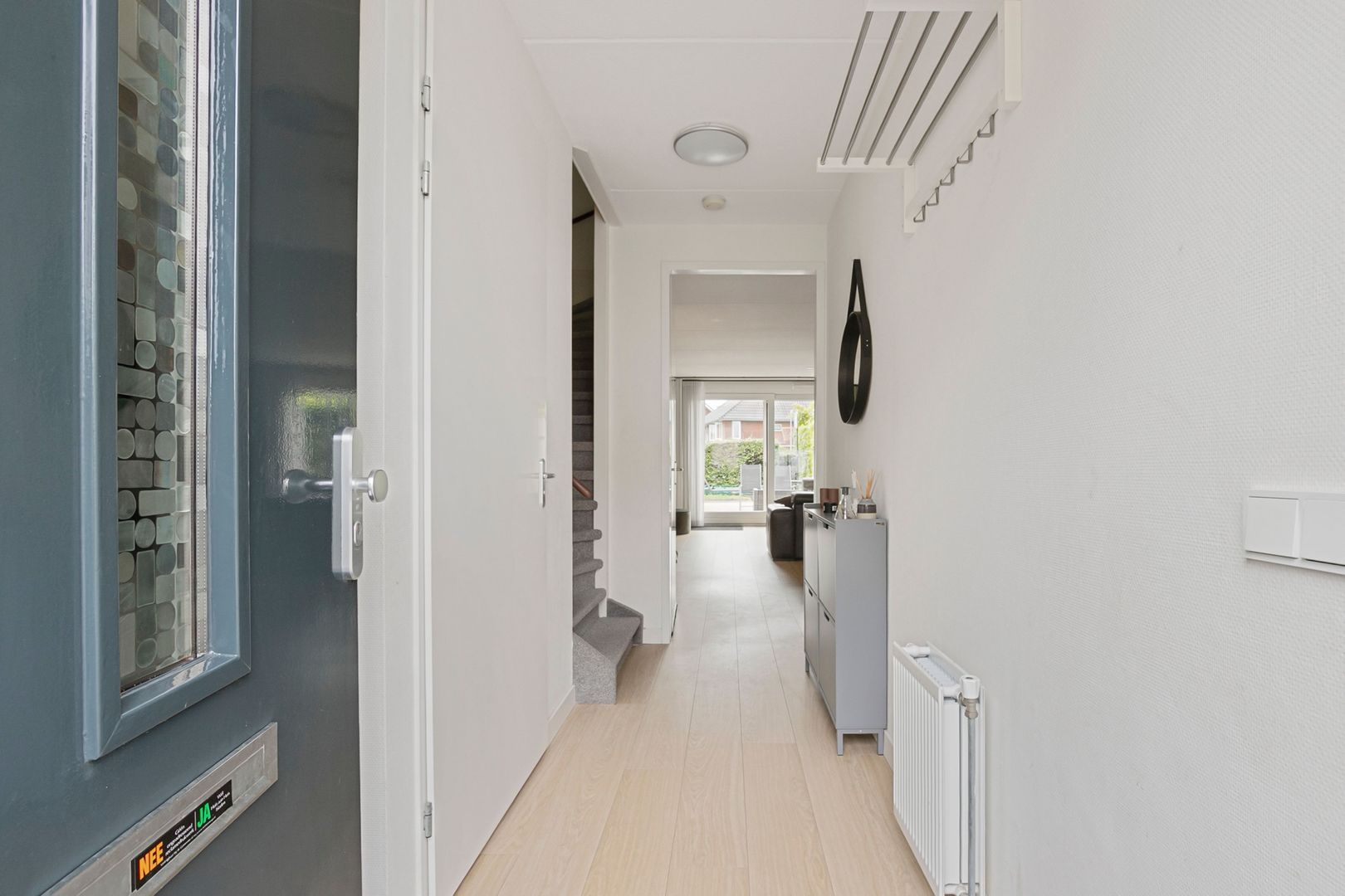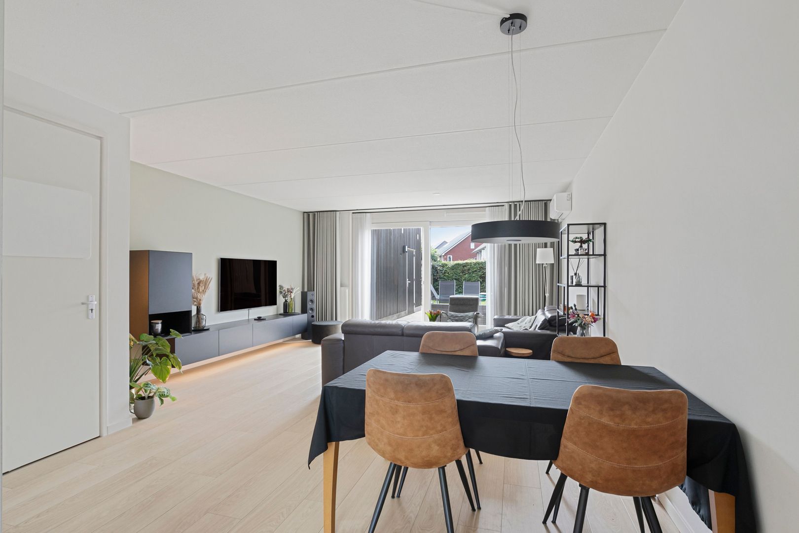 Entree van de woning in de hal. De hal is voorzien van het toilet met fonteintje, de meterkast, de trapopgang en er is ruimte voor de garderobe. Vanuit de hal kom je in de royale leefruimte welke is verdeeld in een ruime zithoek aan de tuinkant met schuifdeur naar het terras. Centraal staat de eethoek met in het verlengde de vernieuwde keuken (2019) voorzien van luxe AEG inbouwapparatuur zoals een inductiekookplaat, vaatwasser, oven, grote koelkast, vriezer en een afzuigkap. Tevens is de begane grond voorzien van een pvc vloer en een airco installatie (2024).
