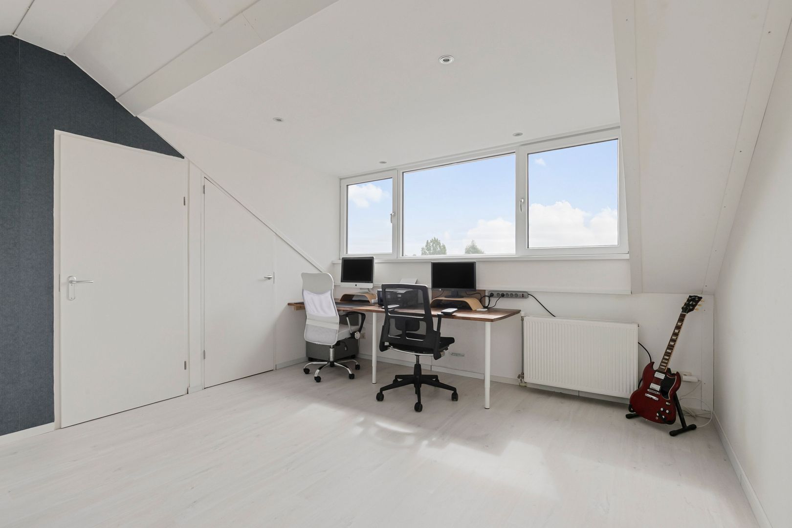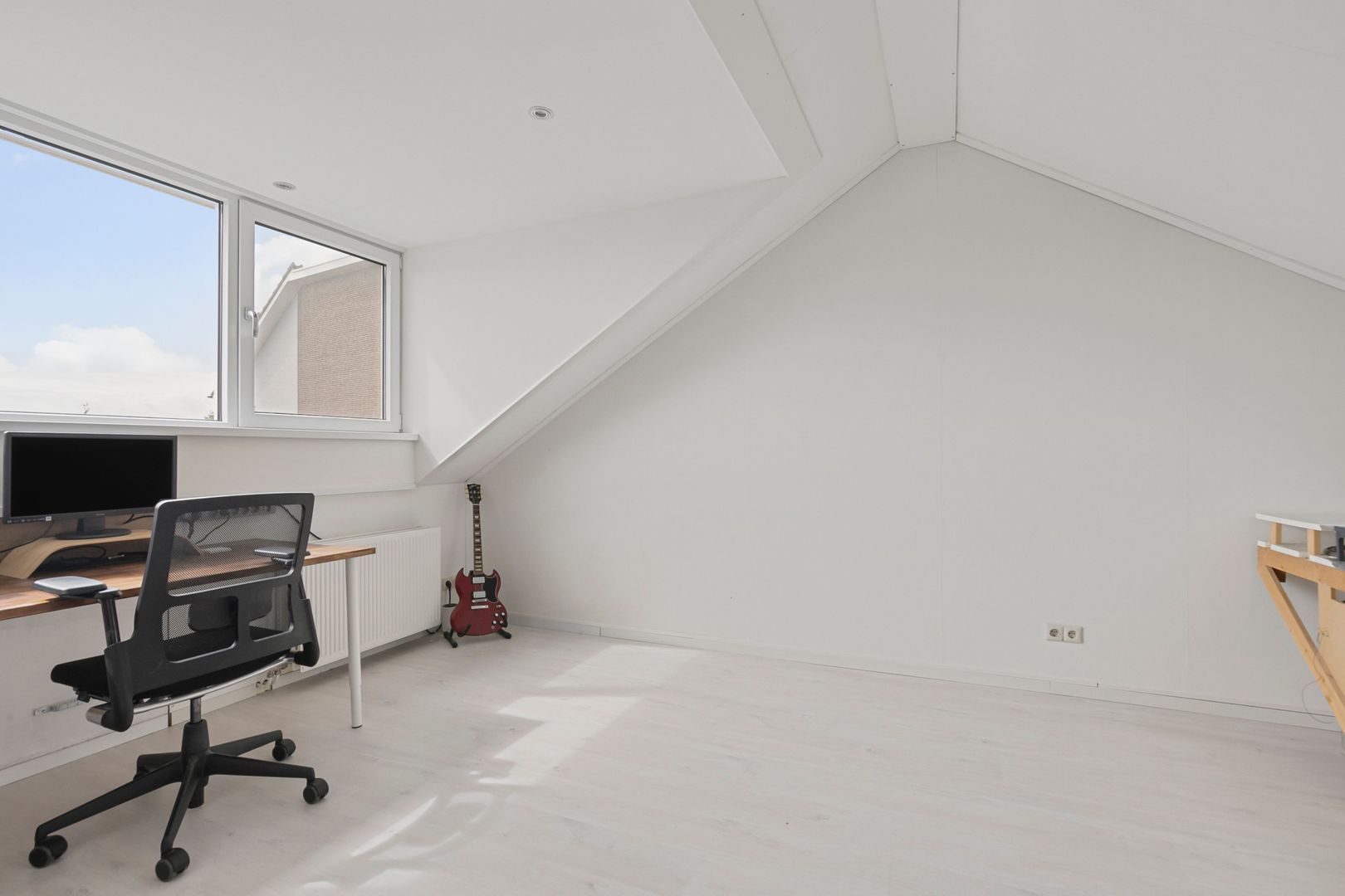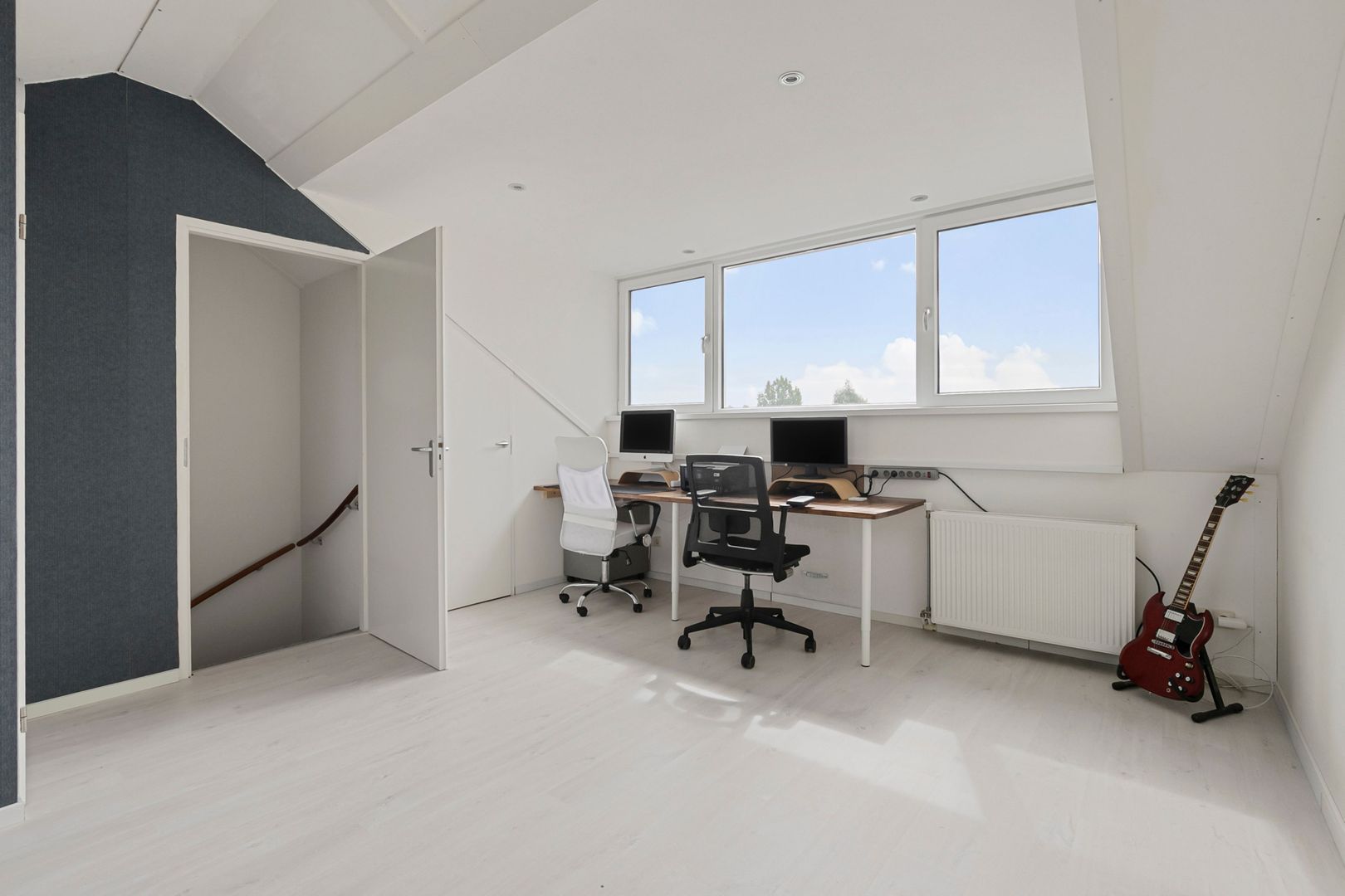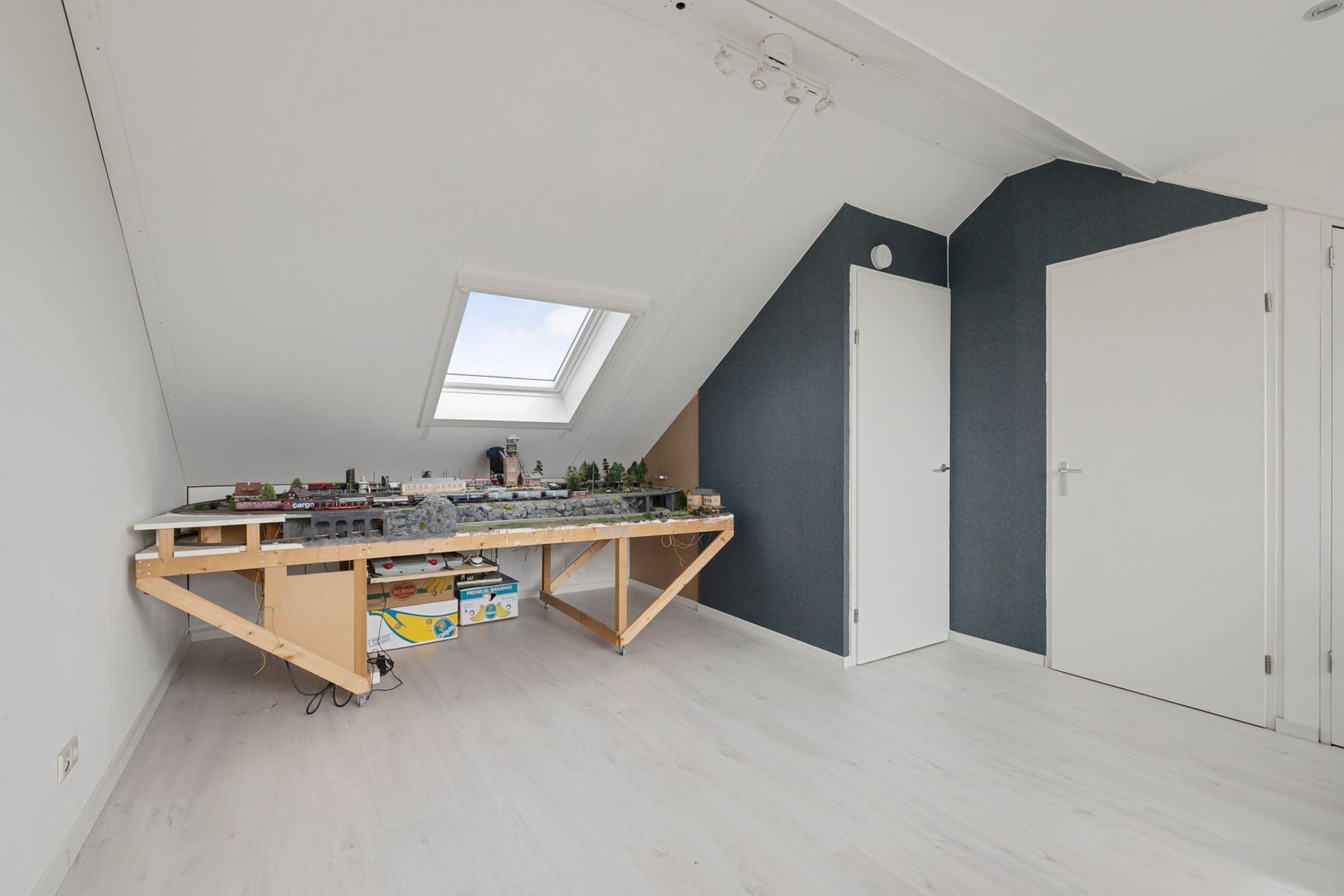 De vaste trap brengt je naar deze ruime 4e kamer nu in gebruik als werkkamer. Door de aanwezigheid van de dakkapel is hier een mooie ruimte ontstaan. Ook vind je hier een plek voor de wasmachine en droger in een handige kast. Tevens is er op deze verdieping bergruimte te vinden.