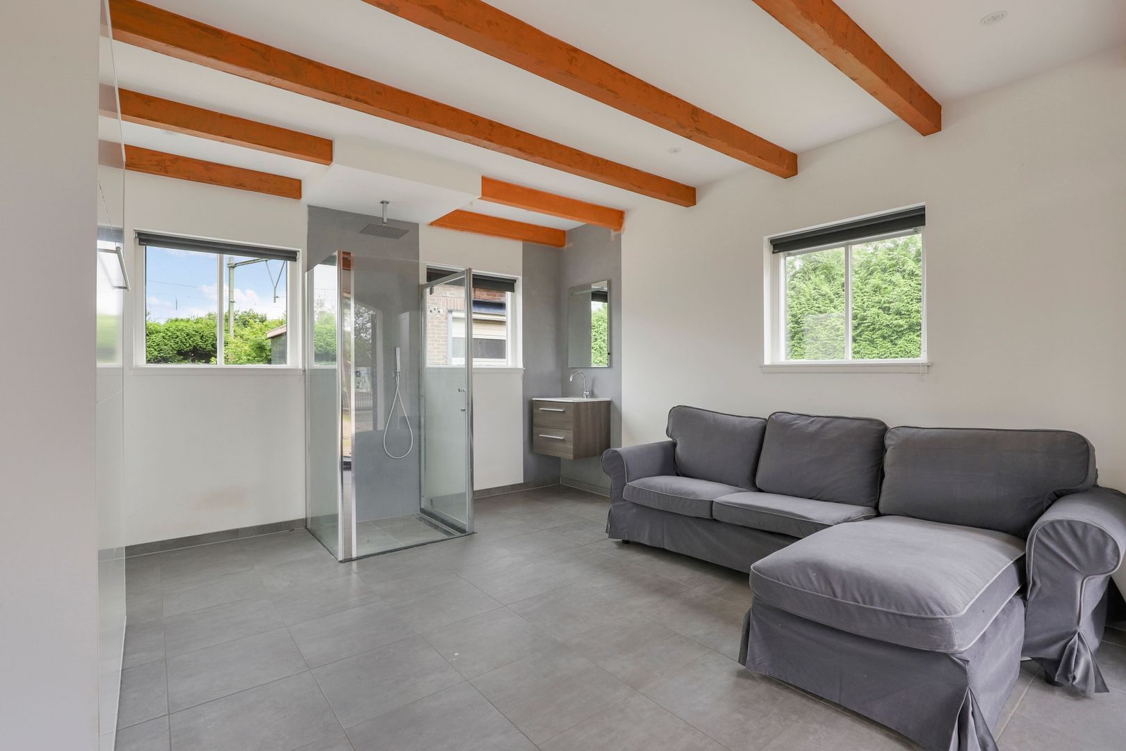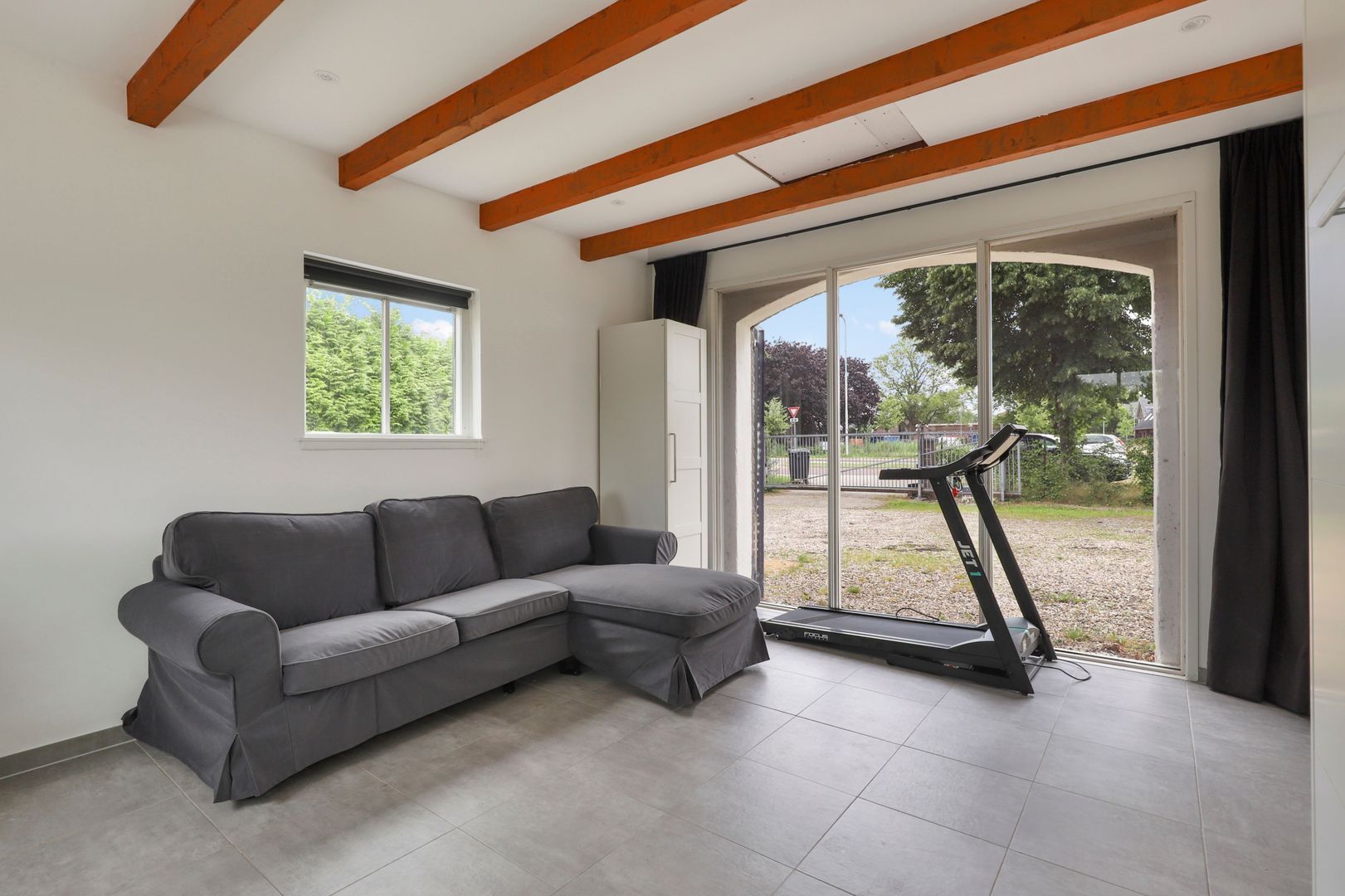 - Grote garage met aangebouwde berging, geschikt voor meerdere doeleinden, voorzien van 20 zonnepanelen