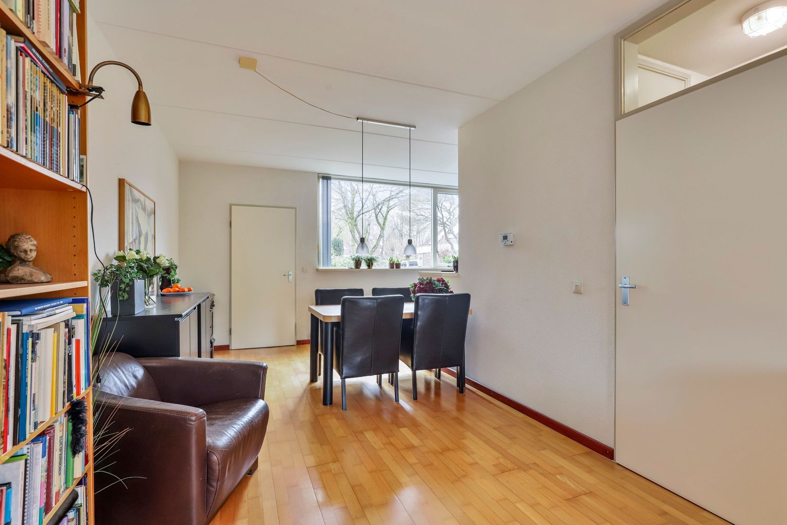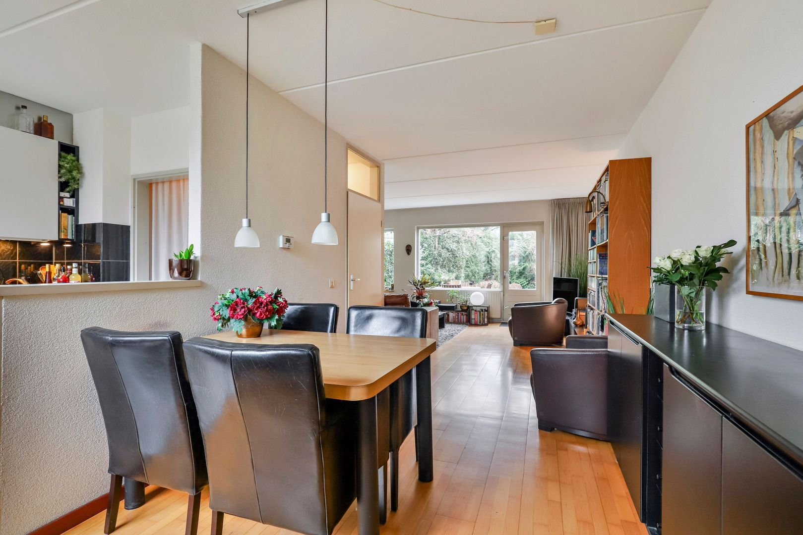 In het verlengde van de keuken kan op meerdere plekken de eethoek worden geplaatst en doorlopend naar de achterzijde is daar de knusse woonkamer met toegang tot de tuin. In een tweede, kleine hal is de trapopgang.
