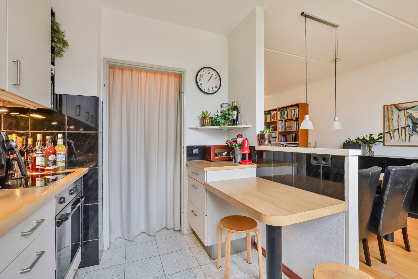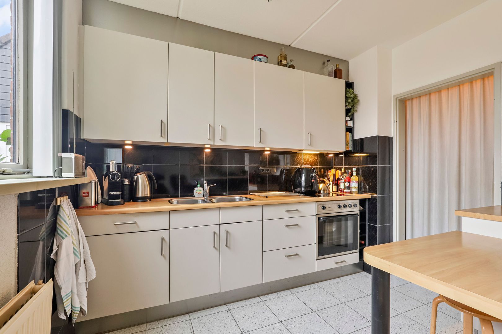 Entree in een kleine hal, hier bevindt zich het toilet met fonteintje en de meterkast. Vanuit de hal kom je in de open keuken welke is voorzien van een keukenblok waarin een dubbele spoelbak, een oven, keramische kookplaat en een afzuigkap. Daar tegenover staat nog een keuken(laden)blokje met er naast een bijbehorende keukenwerktafel. Tussen beide keukenblokken bevindt zich onder de trap een handige (voorraad)bergruimte waar ook de koelkast staat.