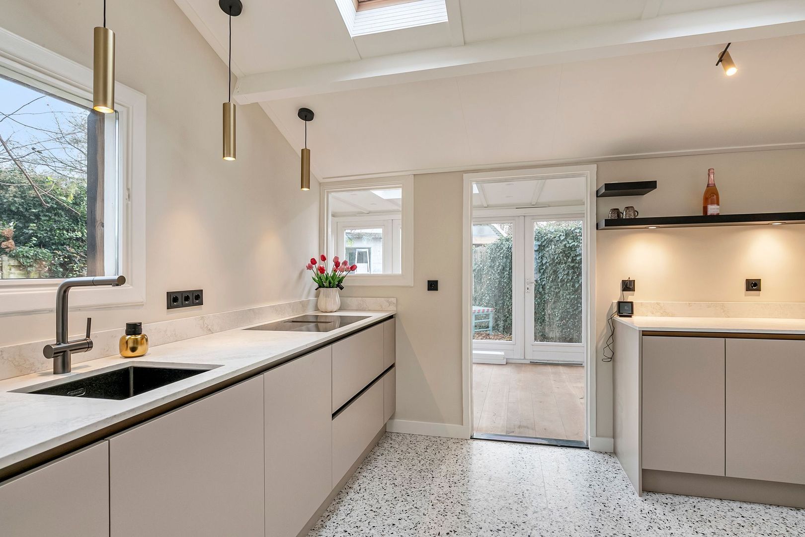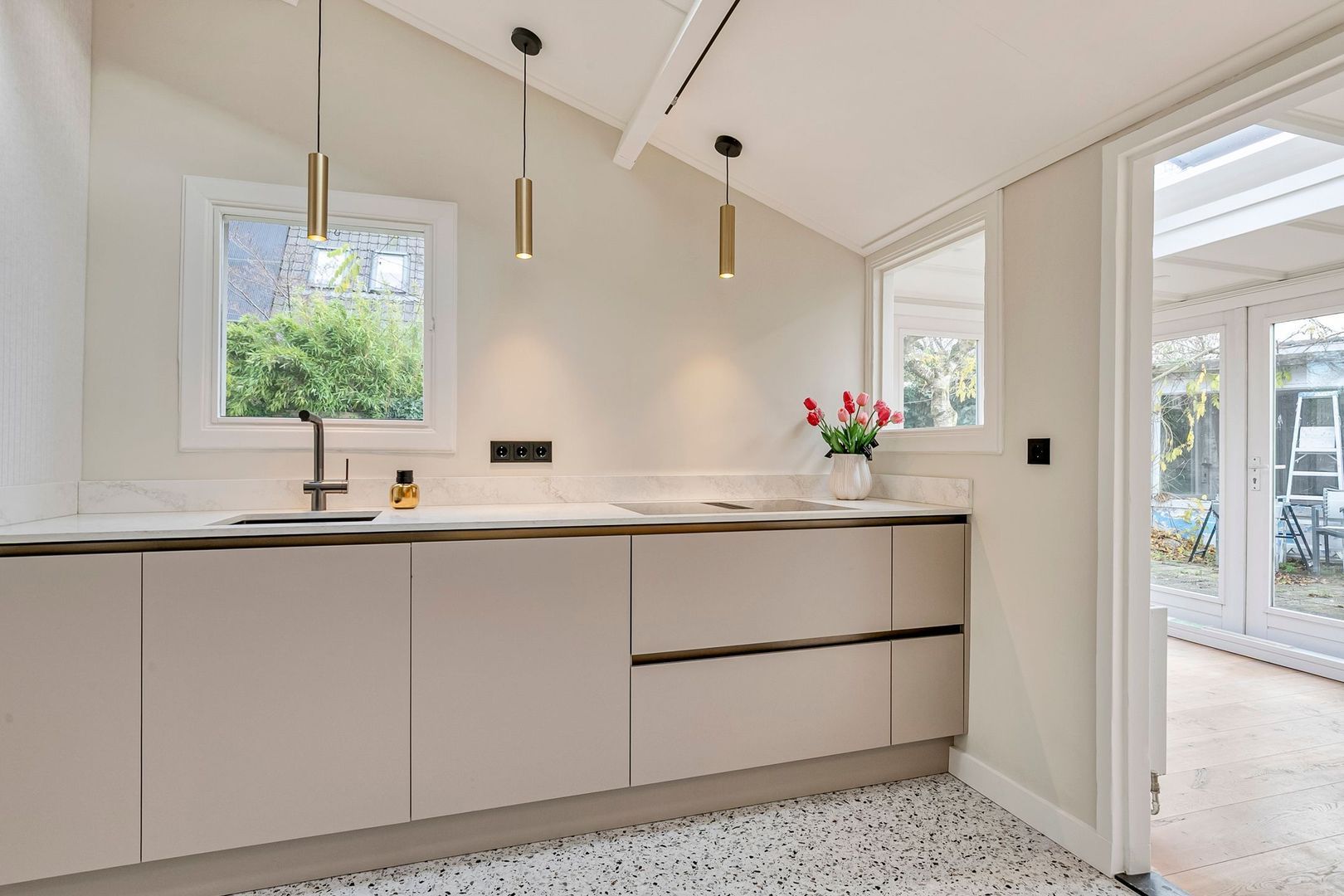 Entree van de woning in de vernieuwde hal. Vanuit de hal kom je in de woonruimte verdeeld in de zithoek aan de voorzijde en de eethoek aansluitend aan de keuken. De nieuwe keuken is vergroot en vernieuwd in 2025 en voorzien van diverse inbouwapparatuur zoals een inductiekookplaat met ingebouwd afzuigsysteem, grote koelkast en aparte grote vriezer, stoomoven en een vaatwasser. De keuken is opgesteld in 3 blokken met lichten kasten en afgewerkt met een licht composiet blad. Vanuit de keuken kom je in de tuinkamer met openslaande deuren naar de tuin. Hier is ook het toilet en de kast met de opstelling van de c.v. combiketel, bouwjaar 2025.